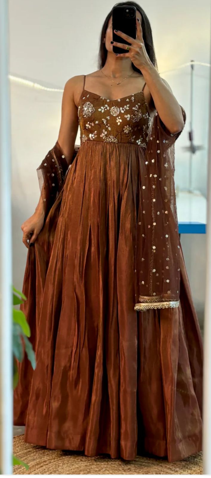 FABRIC DETAILS : GOWN : Heavy Chinon Silk with Sequin & Zari Embroidery Work. INNER...