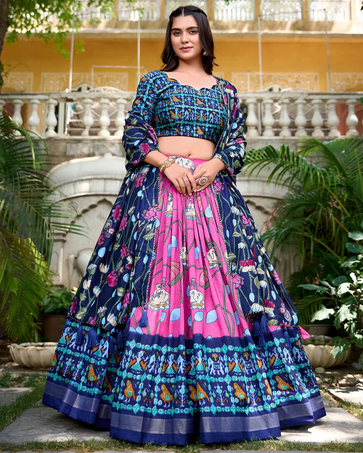SPECIFICATIONS:Lehenga : StitchedLehenga Fabric : Tussar Silk Lehenga Work : Pichwai With Patola Print And Zari...