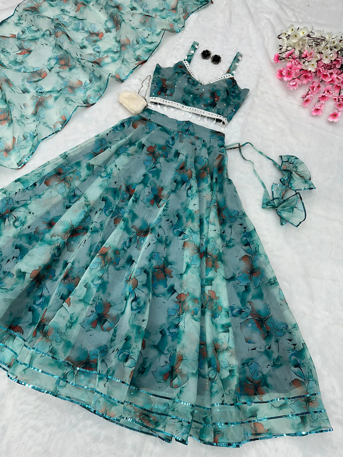Multi Floral Print Green Color Organza Silk Lehenga Choli