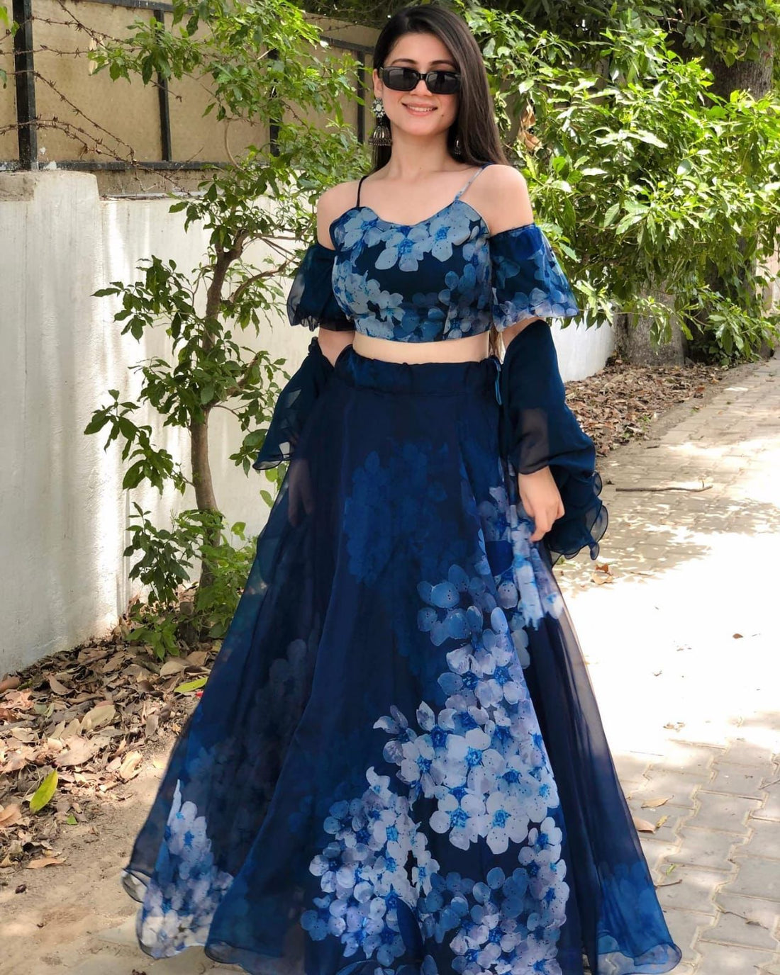 Party Wear Digital Print Organza Silk Blue Lehenga Choli