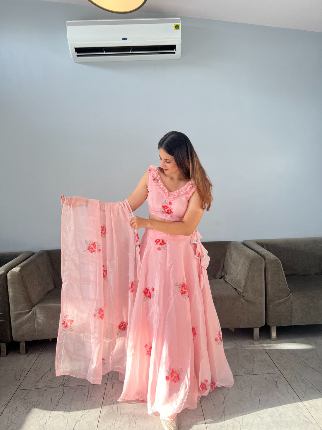 Dusty Pink Organza Silk Floral Printed Lehenga Choli