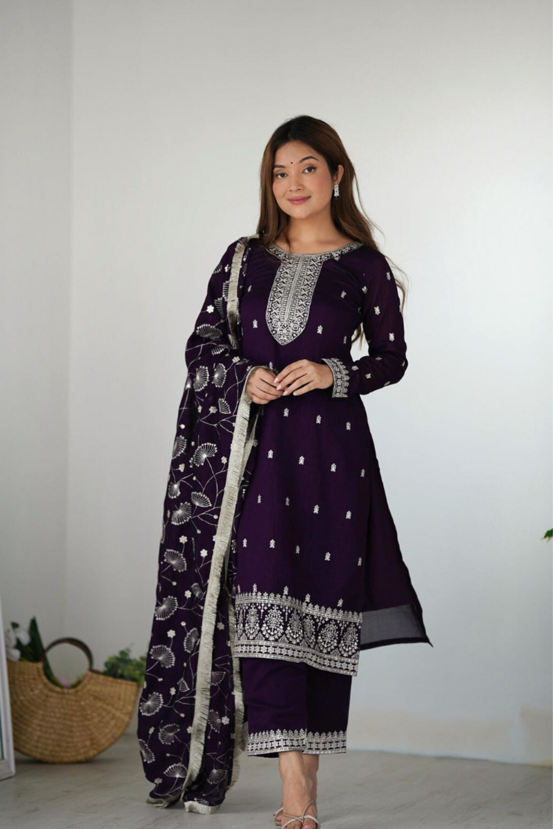 Introducing the Premium Designer Wine Colour Kurti-Plazzo-Dupatta Set, a perfect fusion of sophistication and contemporary...