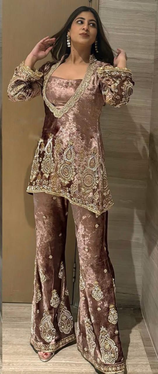 FABRIC DETAILS : TOP : Viscose velvet with sequin embroidery and mirror work. LENGTH :...