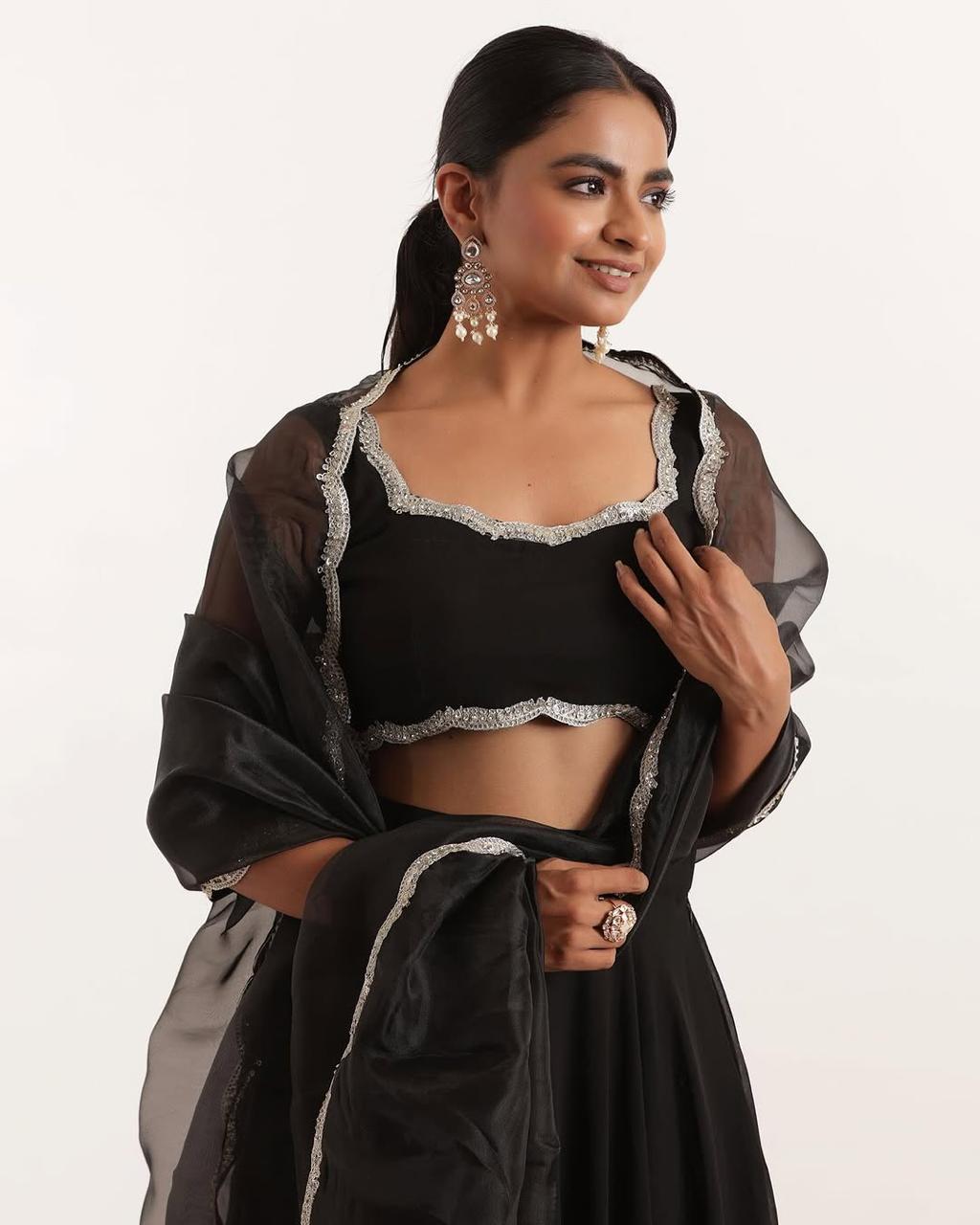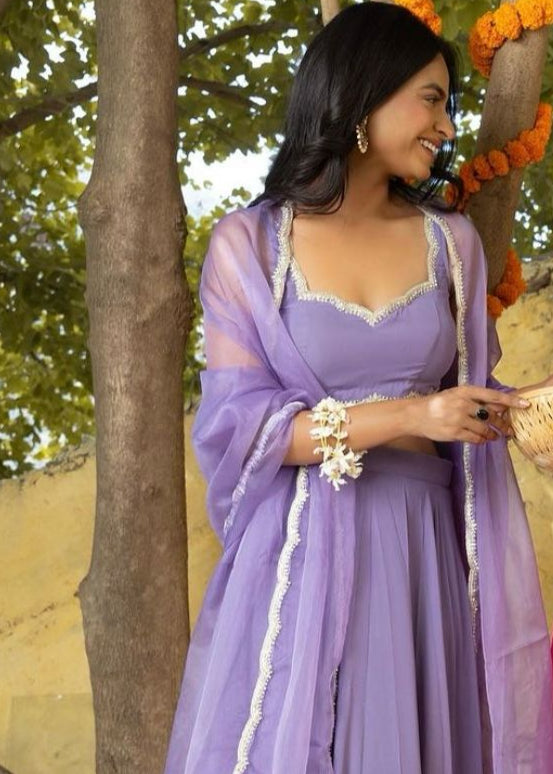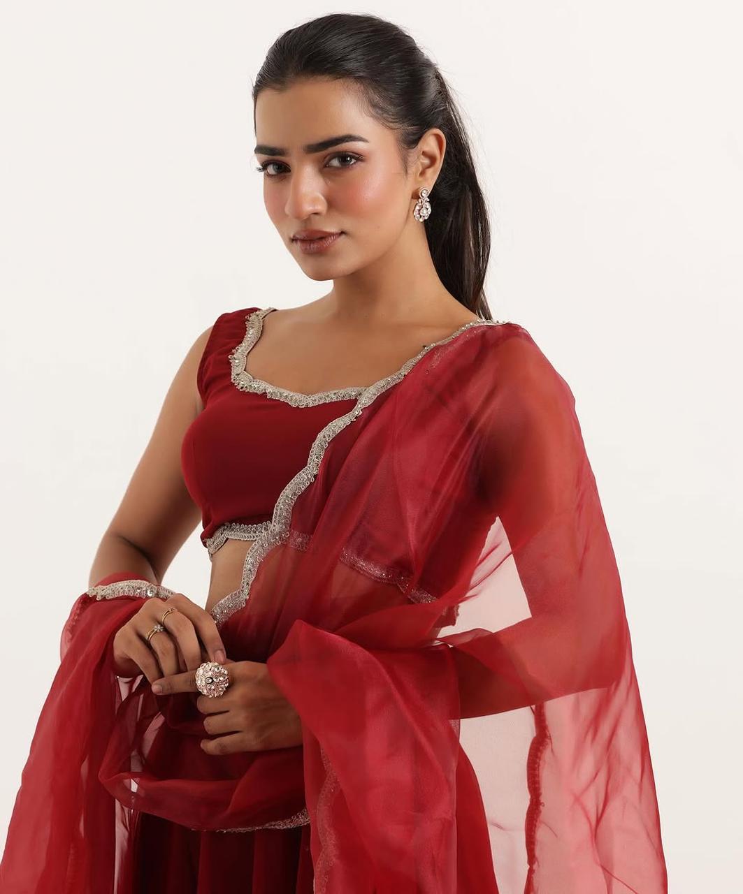 Lehenga: A pure georgette lehenga with an 8-meter flair, fully stitched and adorned with a canvas patta.