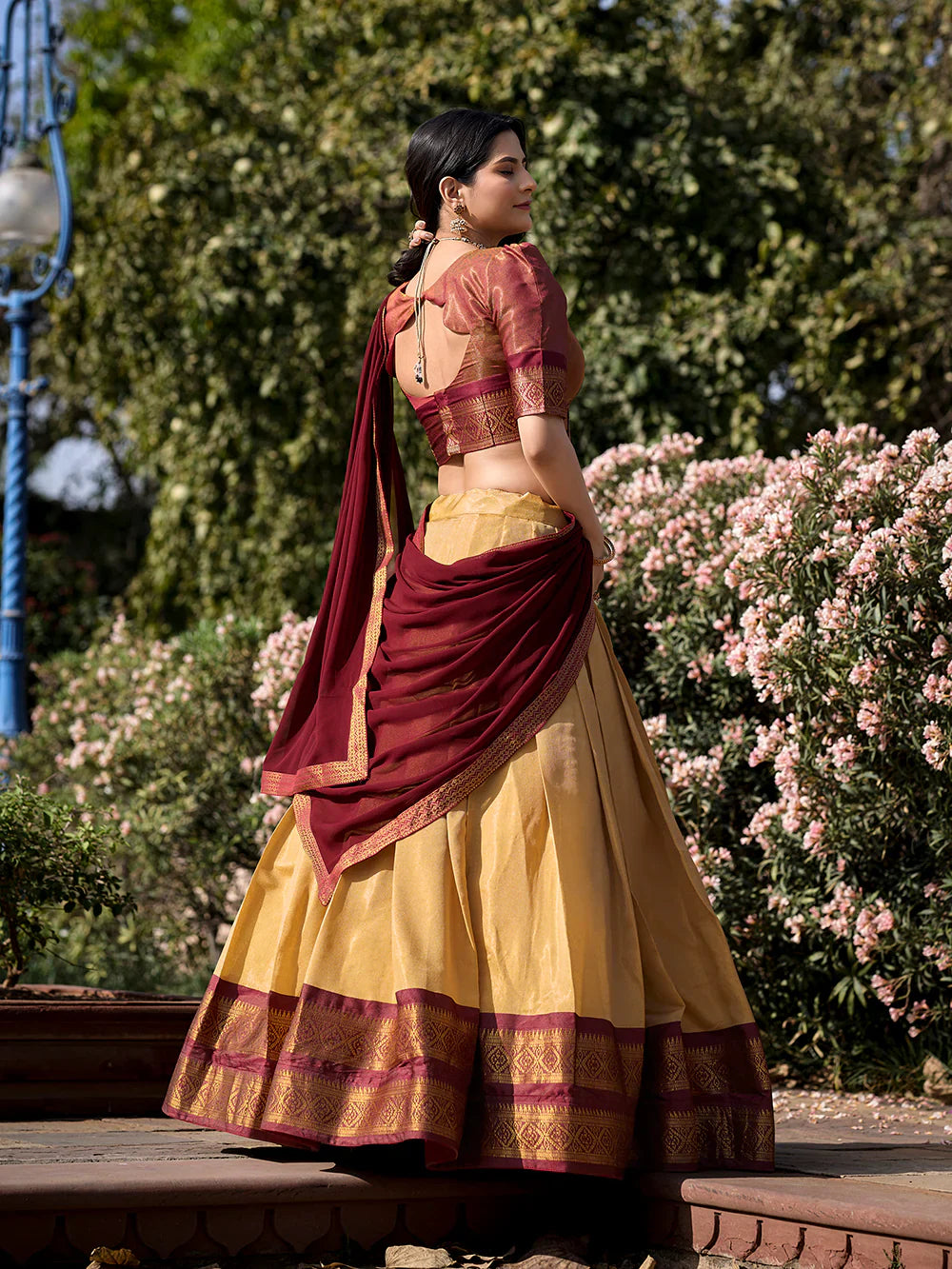 Cream Color Zari Weaving Work Kanchipuram Lehenga Choli