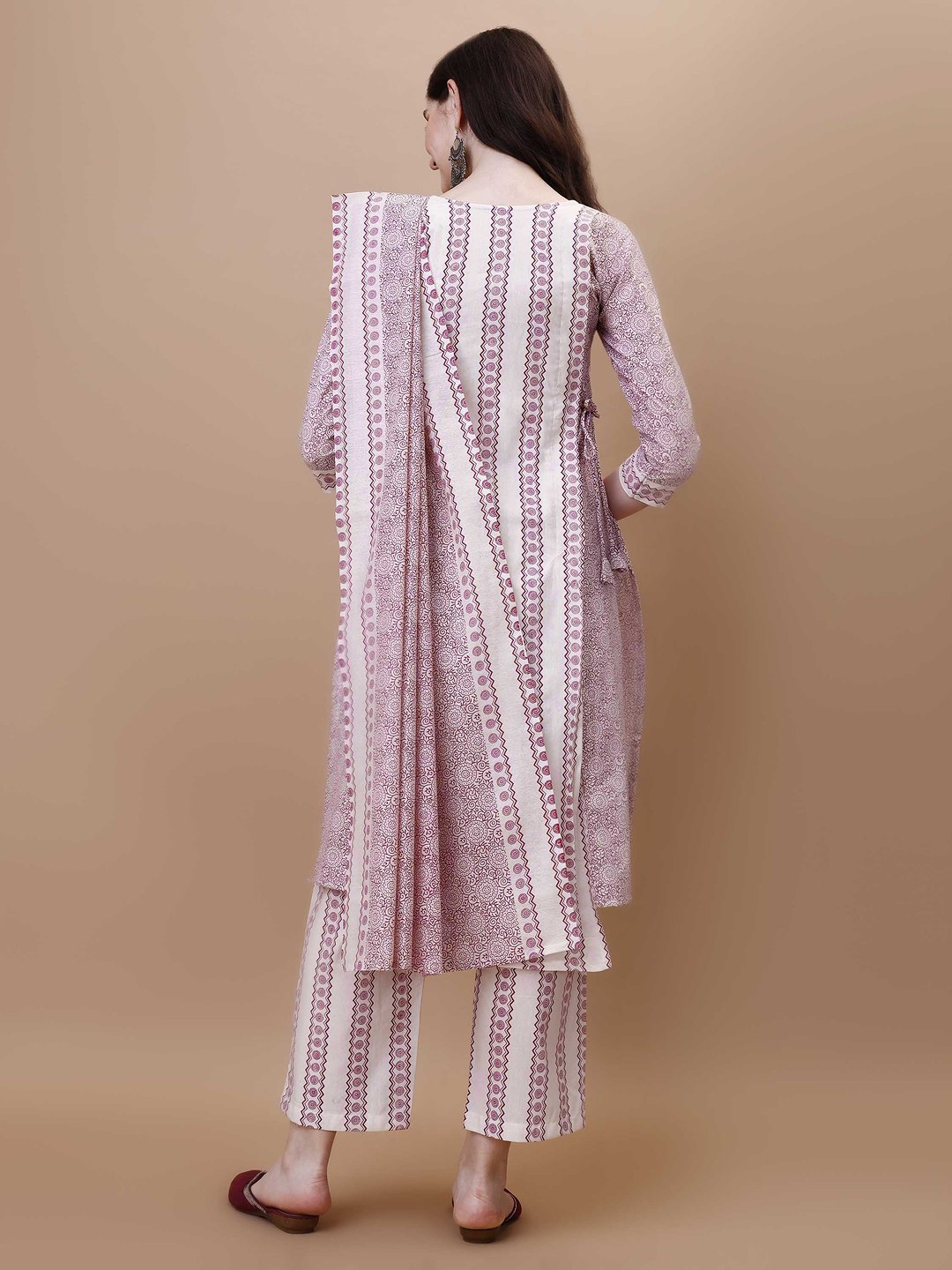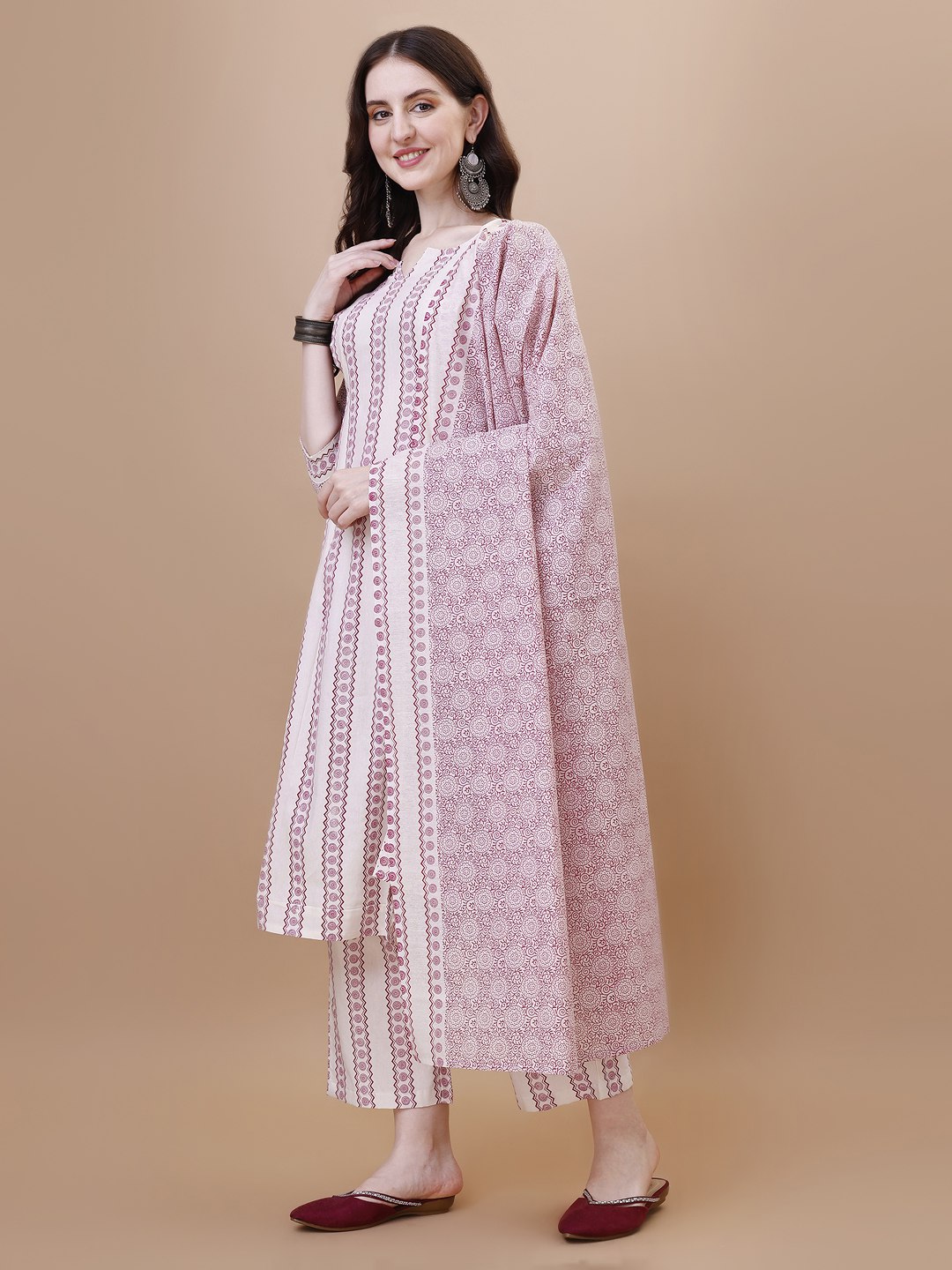 This beautiful Kurta Set is crafted from soft cotton printed fabric, featuring a round neck and a straight kurti with a divider plaza. The set includes a matching cotton dupatta and a fully stitched bottom, providing both comfort and style for any occasion.