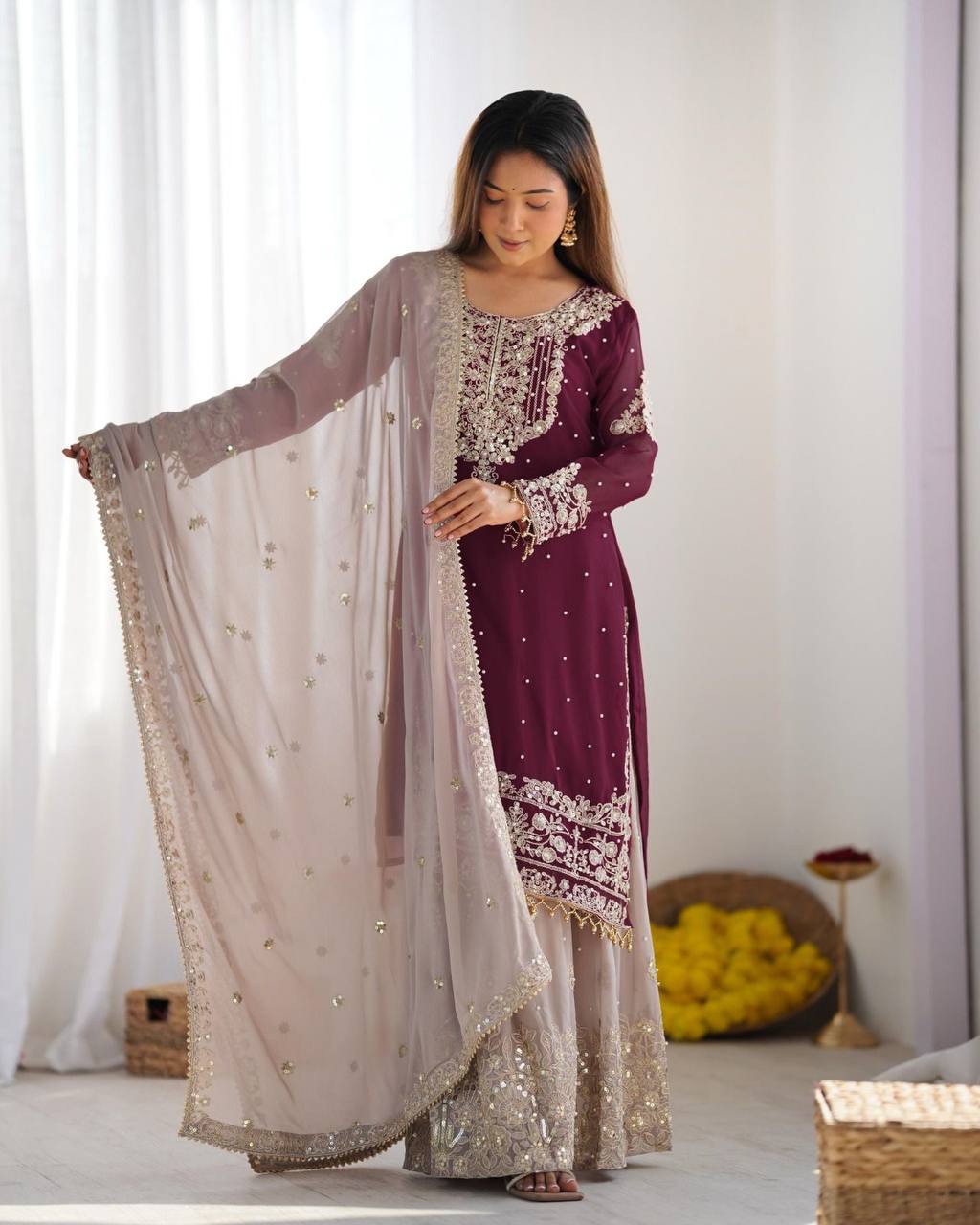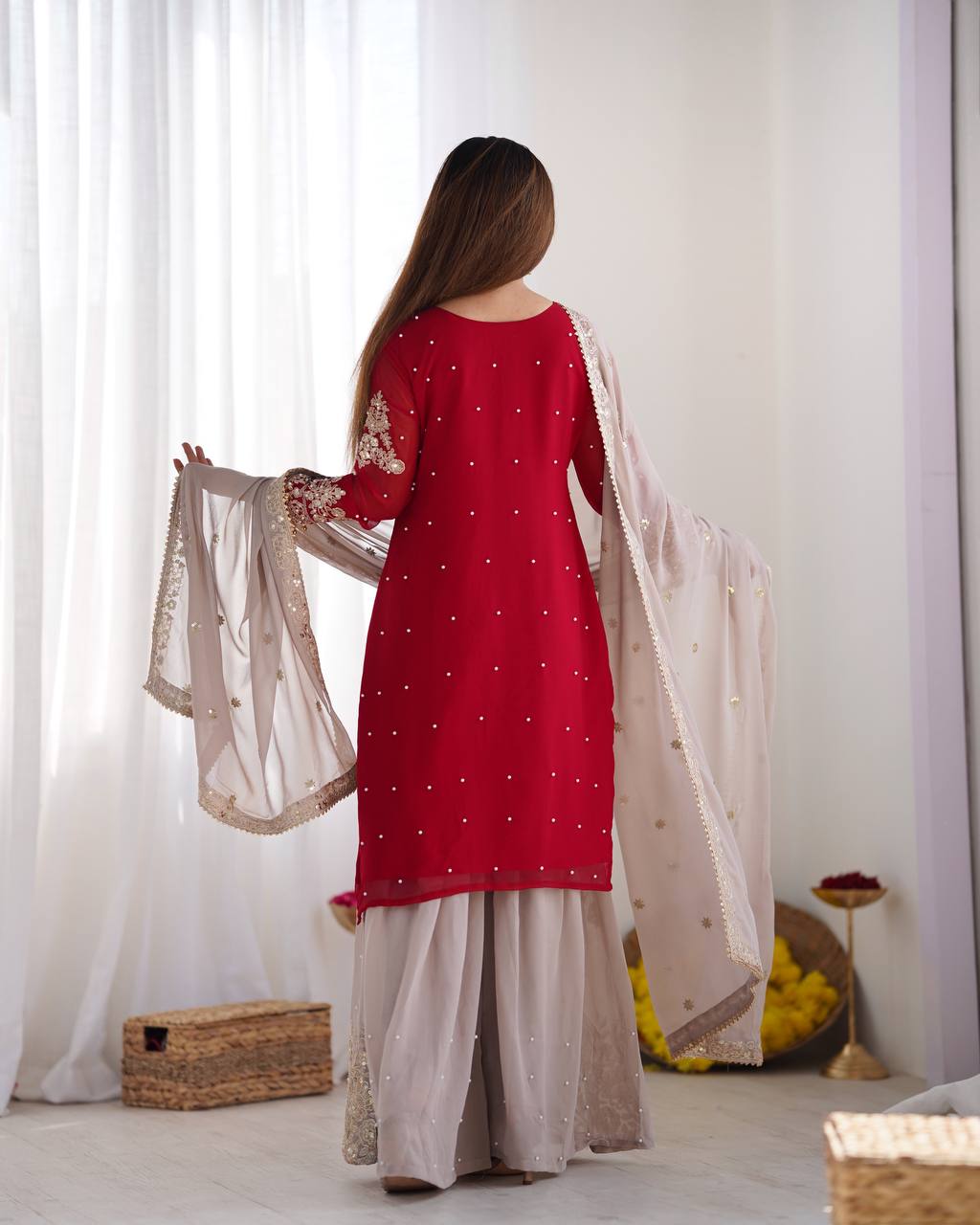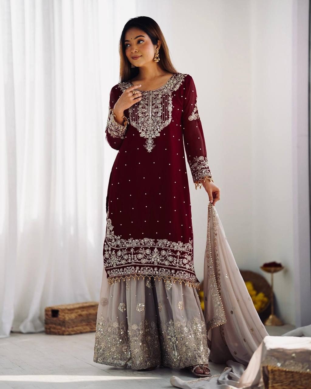 Fabric: Heavy Faux Georgette with Embroidery Coding Dori & Sequence Work + Rivet Moti Work