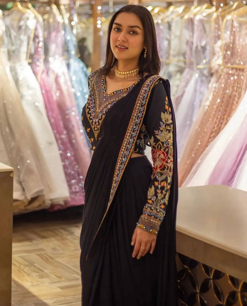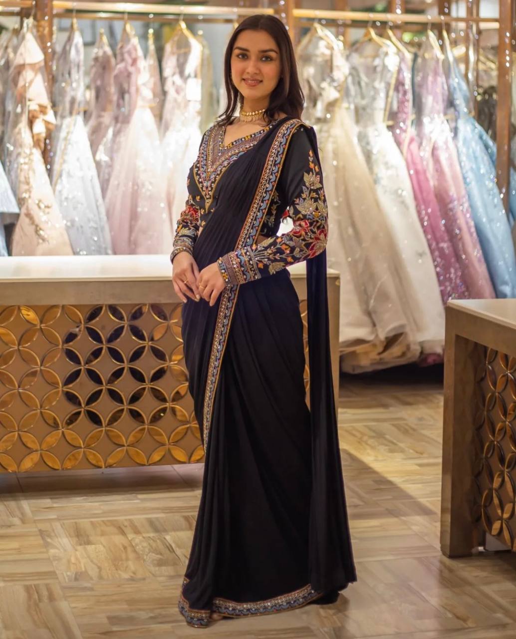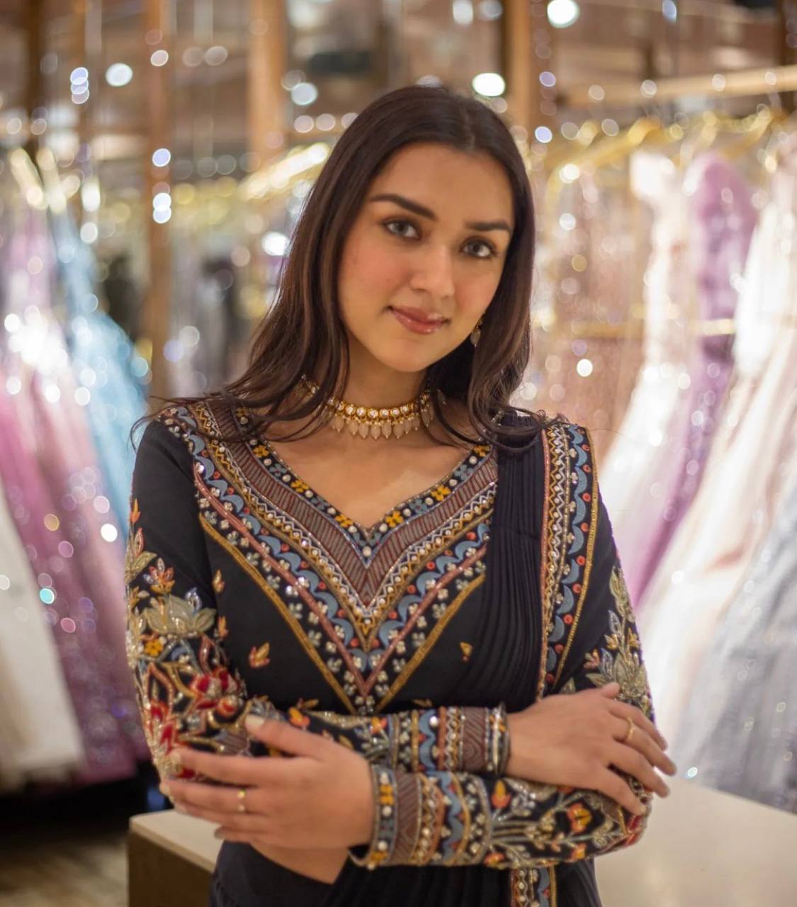 The ethereal beauty of this stunning black ensemble lies in its intricate hand-embroidered patterns, meticulous