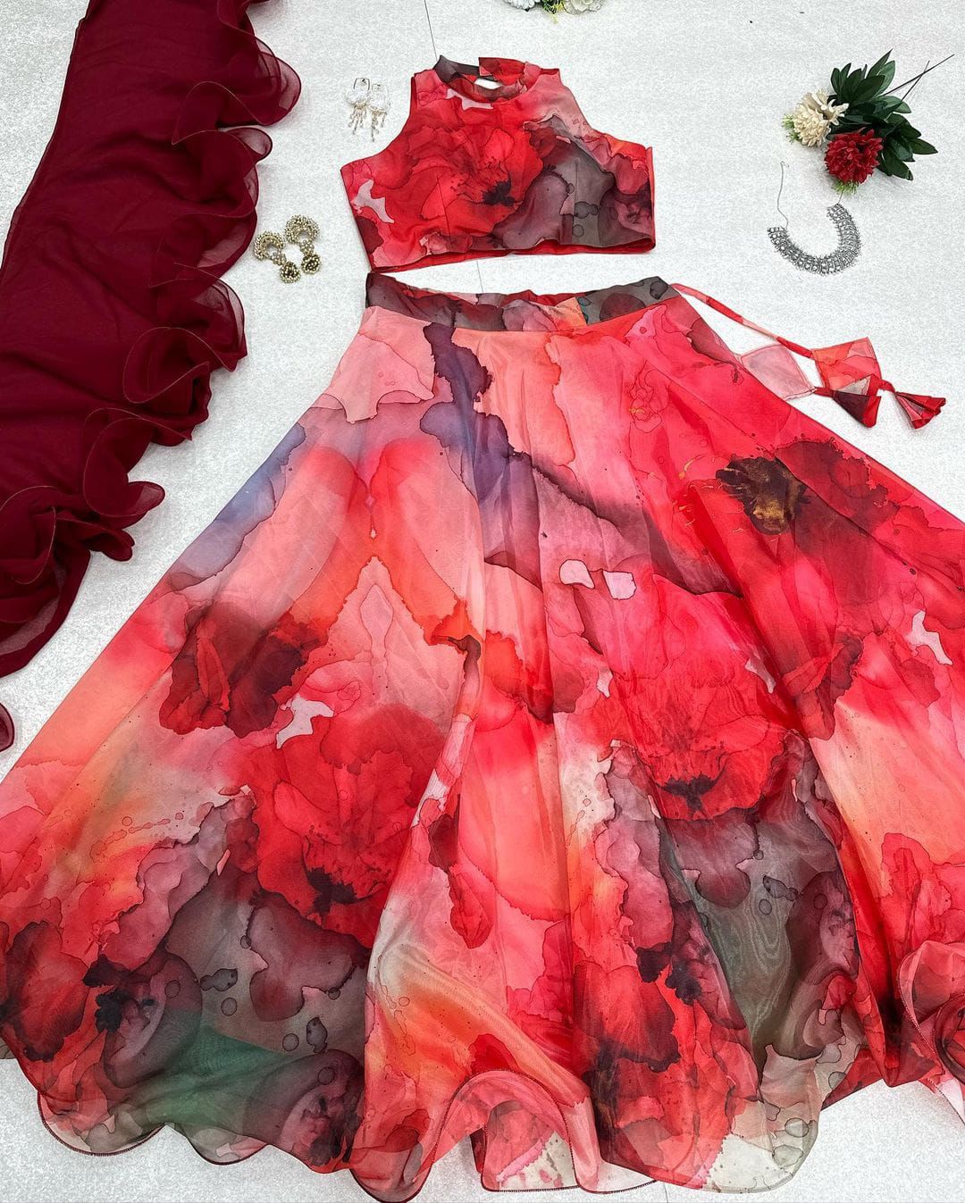 Digital Printed Red Color Organza Lehenga Choli