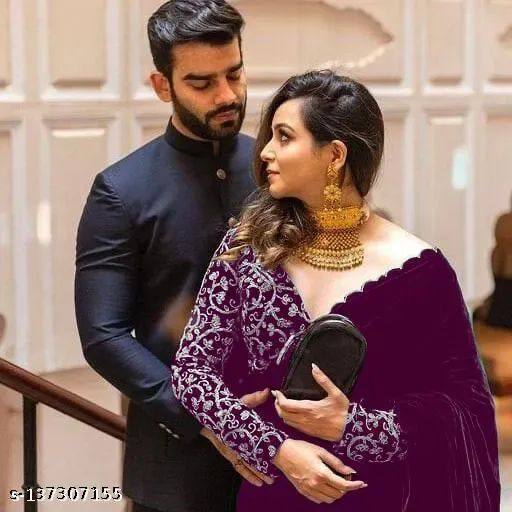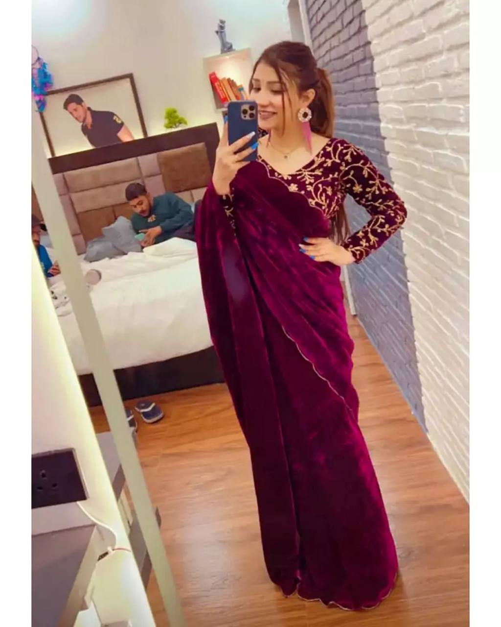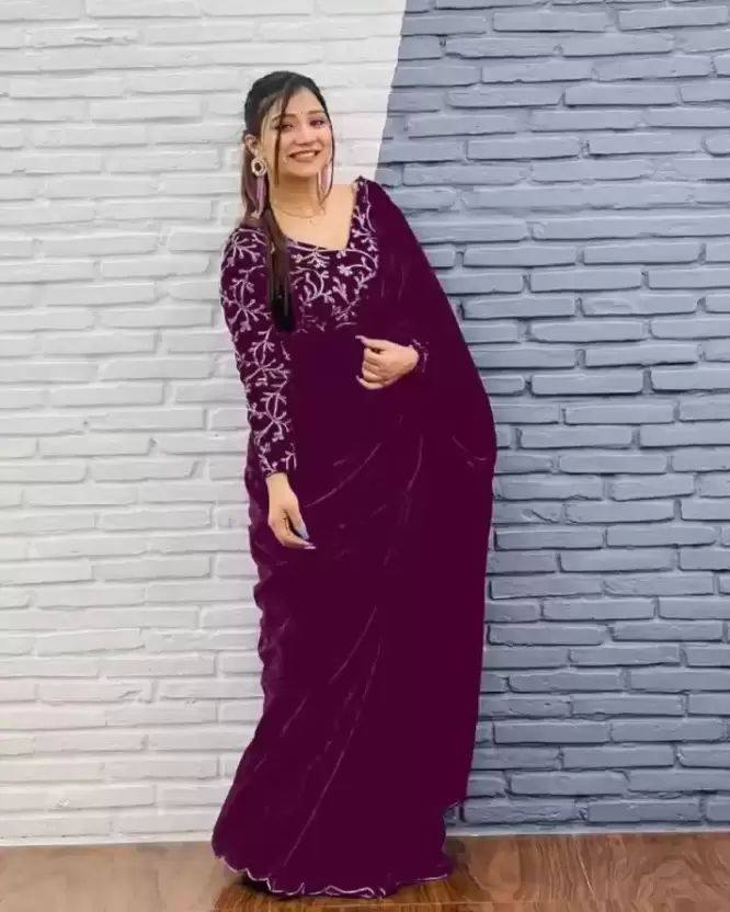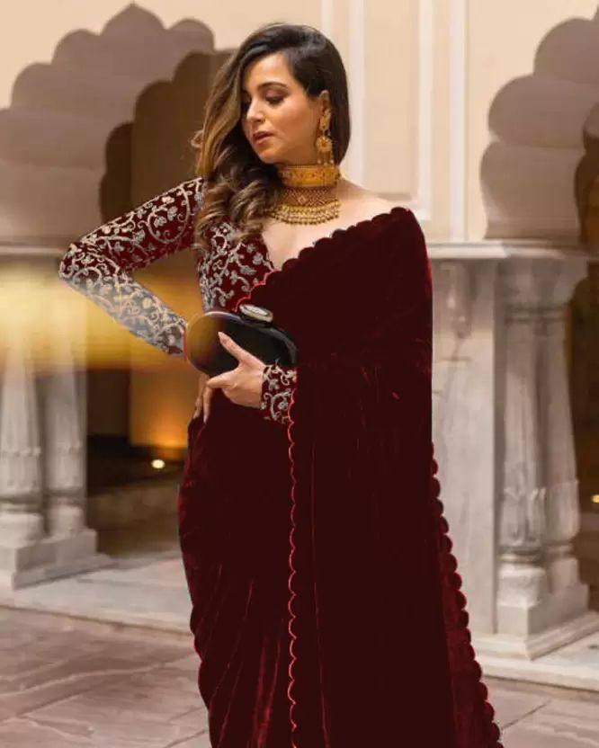 Indulge in timeless elegance with our Elegant Velvet Saree. Luxuriously draped in sumptuous velvet, this saree effortlessly combines sophistication with comfort. The rich texture of velvet adds a touch of opulence, making it perfect for special occasions and celebrations. The saree's graceful drape and subtle sheen create an alluring silhouette, ensuring you stand out with understated glamour.