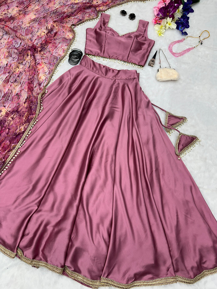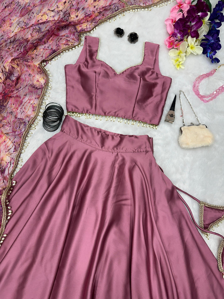 Fancy Satin Silk Dusty Pink Lehenga Choli With Net Dupatta