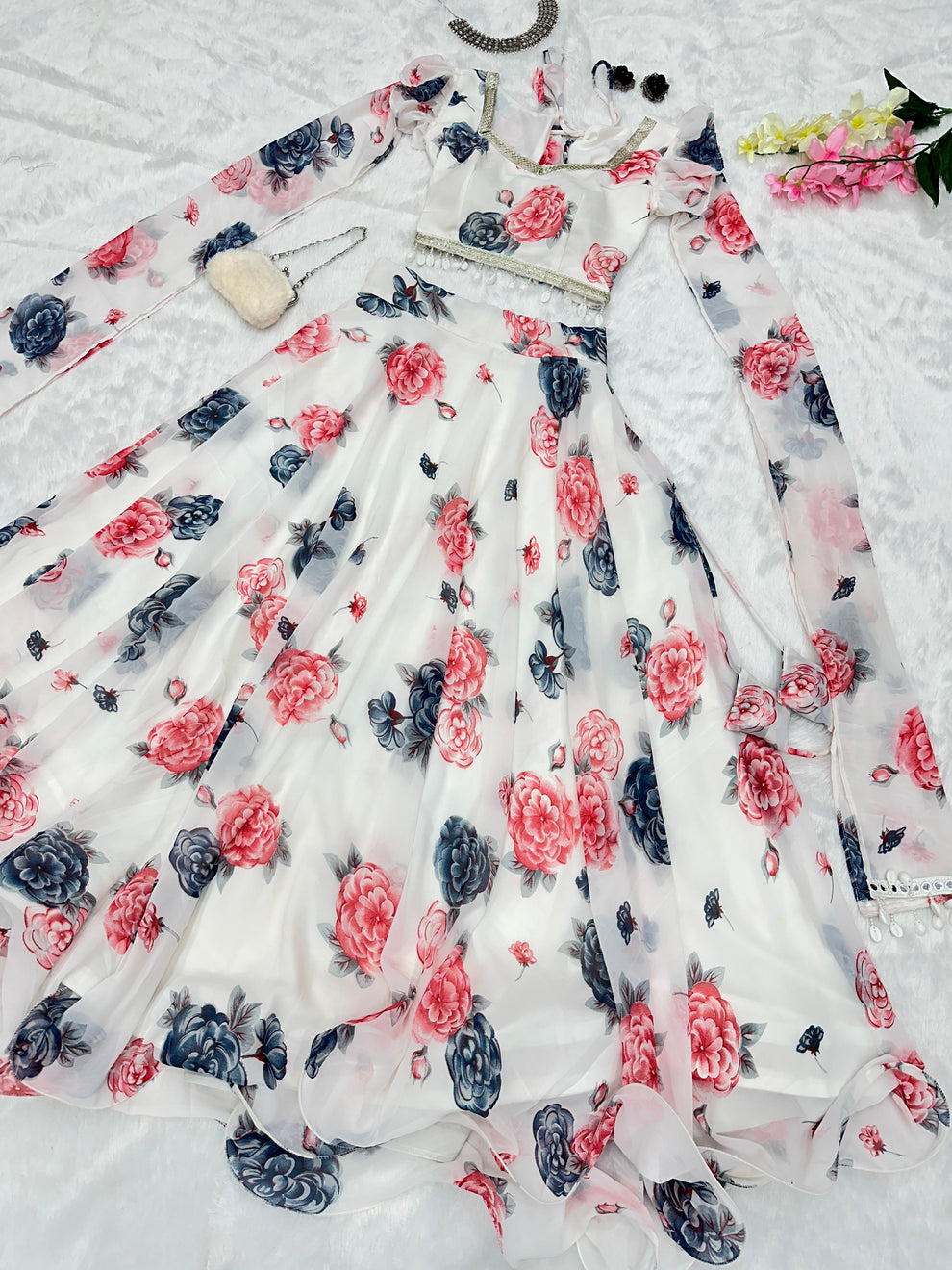 Fancy Sleeves Pattern Flower Print White Lehenga Choli