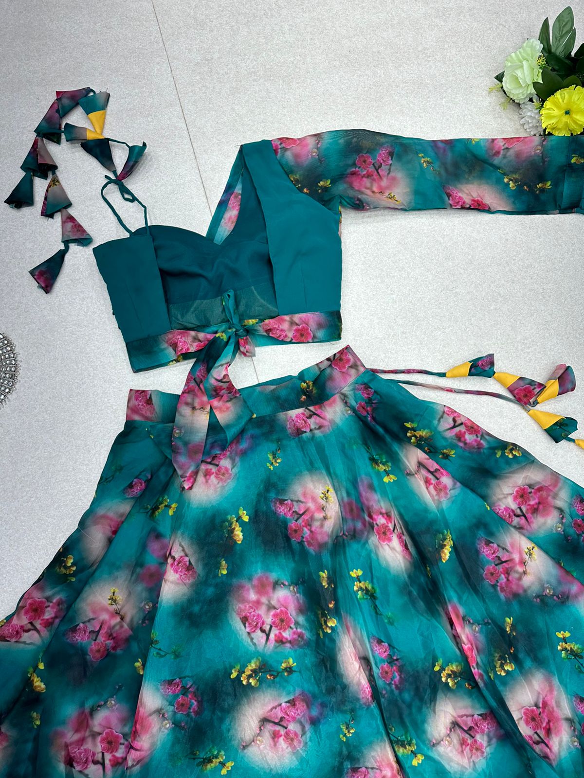 Floral Printed Teal Blue Color Lehenga With One Shoulder Blouse