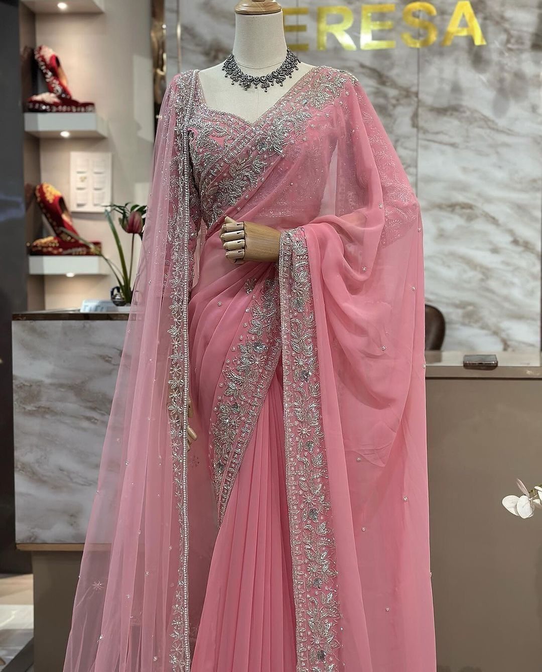 Saree : Soft Net Saree With Heavy Hand Embroidered Work (Blouse Unstitched)