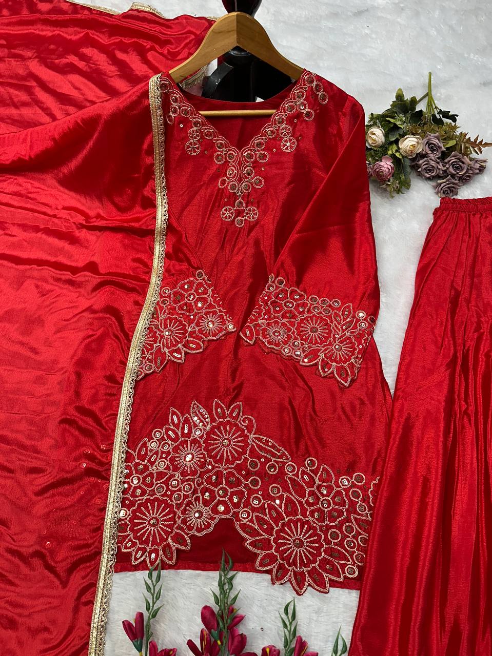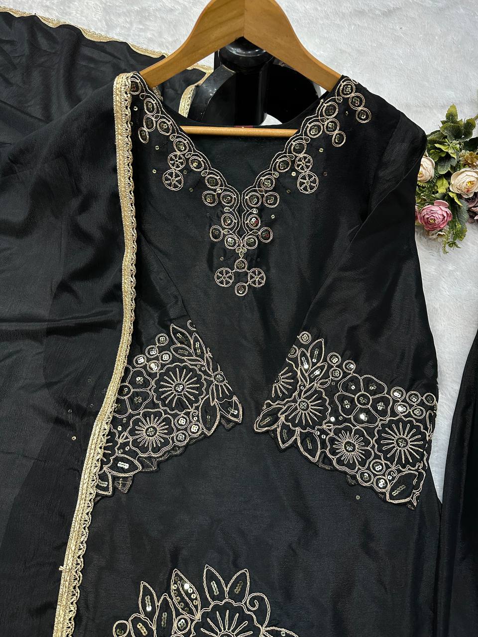 Bring home this timeless beauty crafted in luxurious Heavy Chinon Silk, adorned with intricate embroidery work that speaks elegance in every thread.