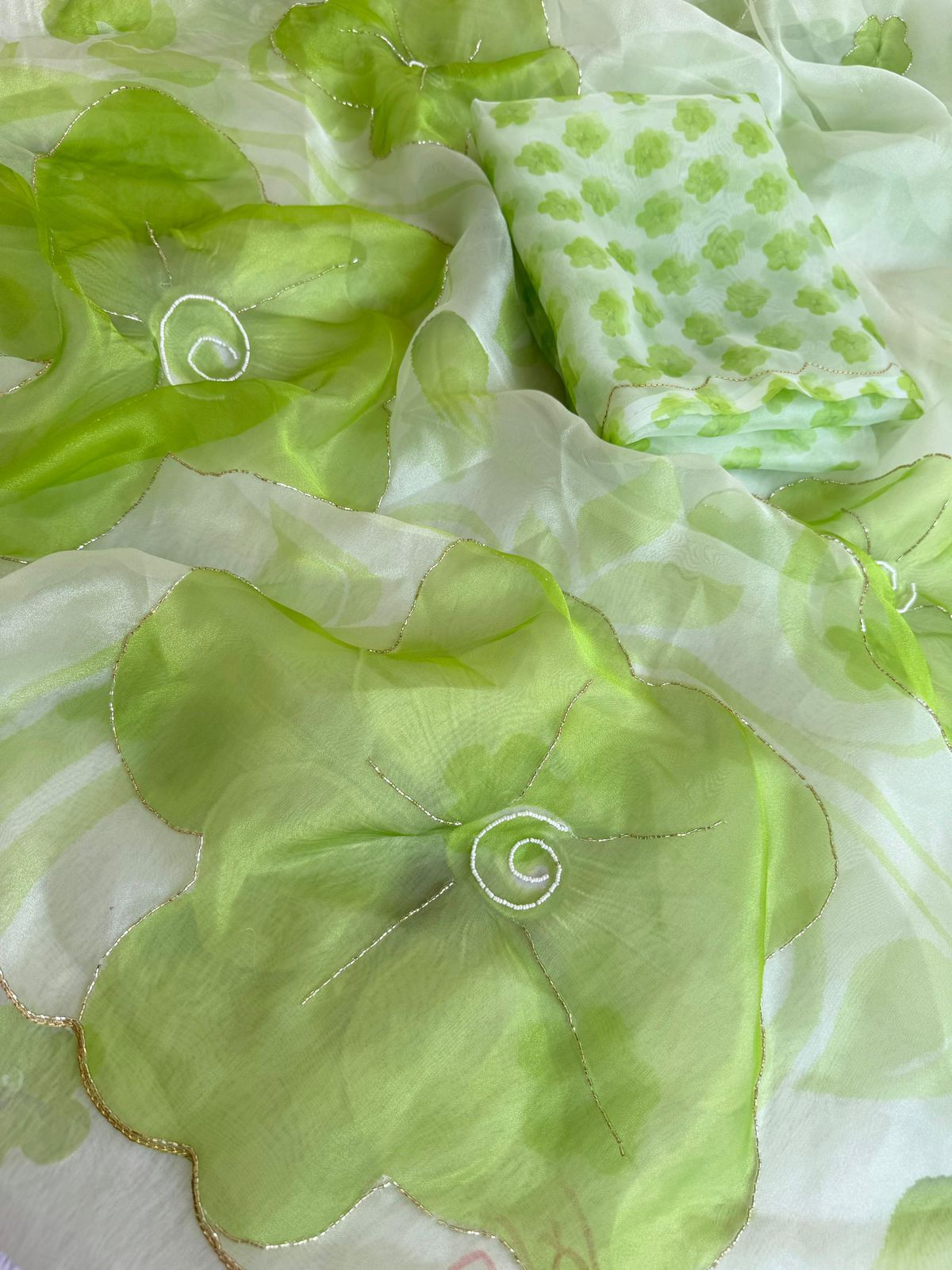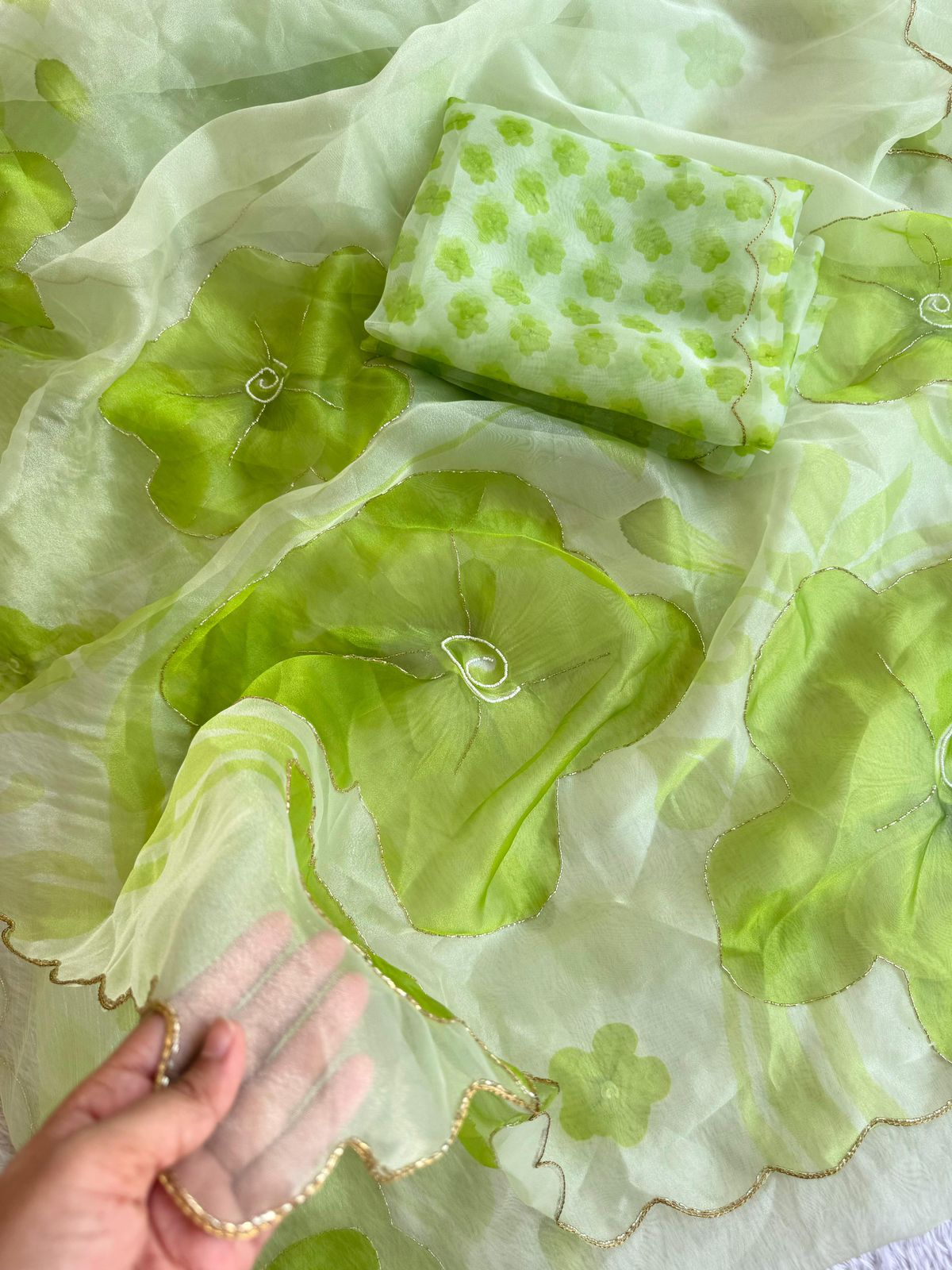 Saree: Soft organza digital saree featuring exquisite moti and kardana handwork.