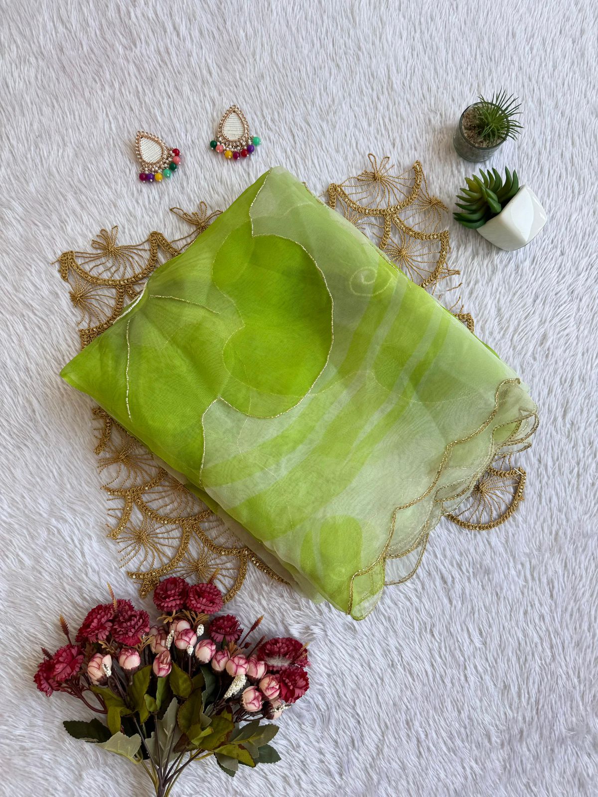 Work: Adorned with full moti handwork on the organza saree, complemented by an aarka and kardana border.