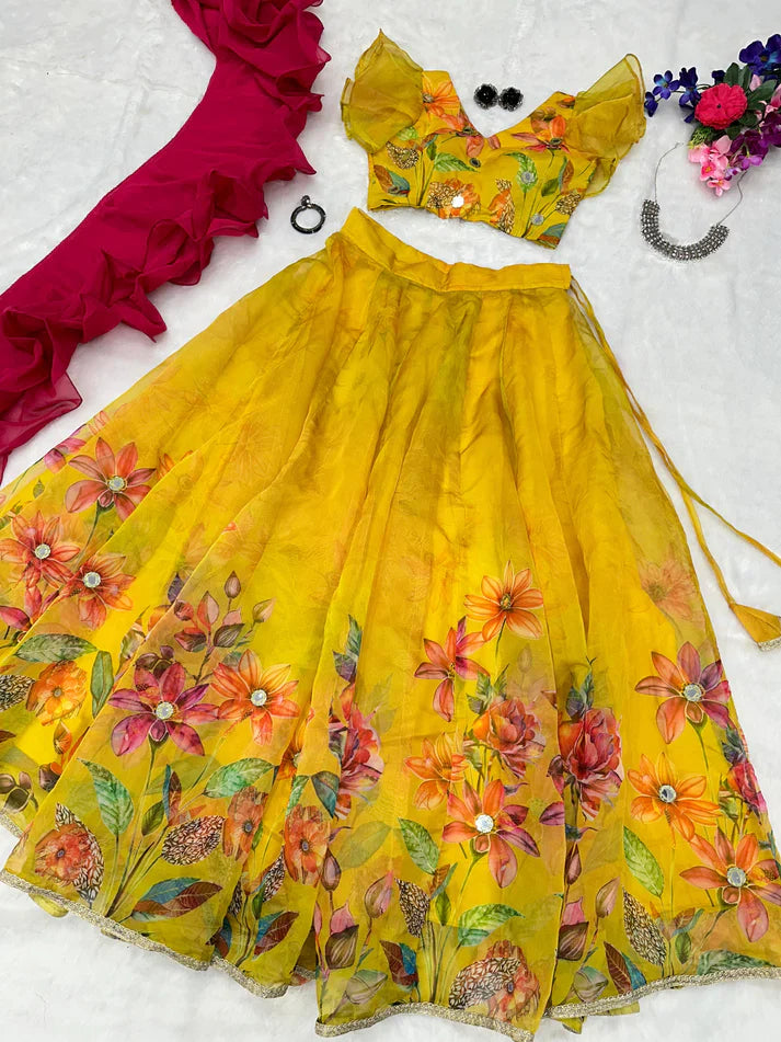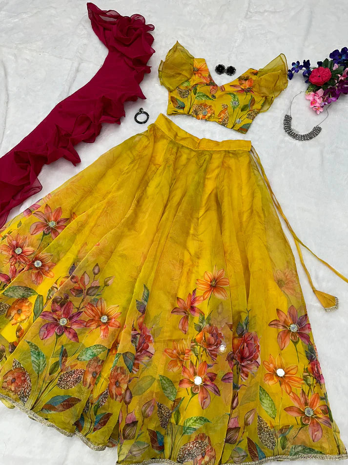 | Work | Floral Printed Kali Lehnga With Real Mirror |