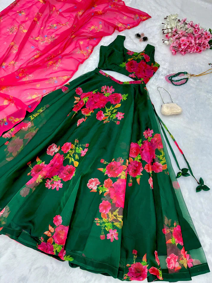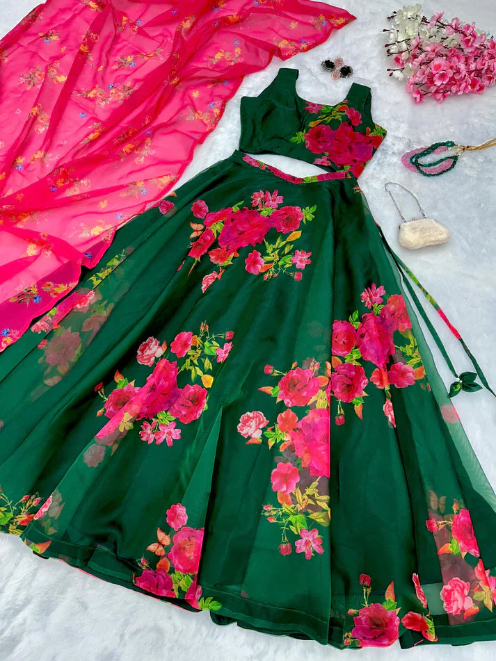 Multi Floral Print Green Color Organza Silk Lehenga Choli