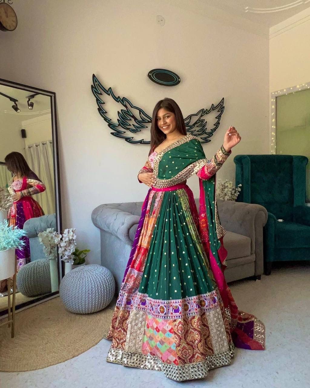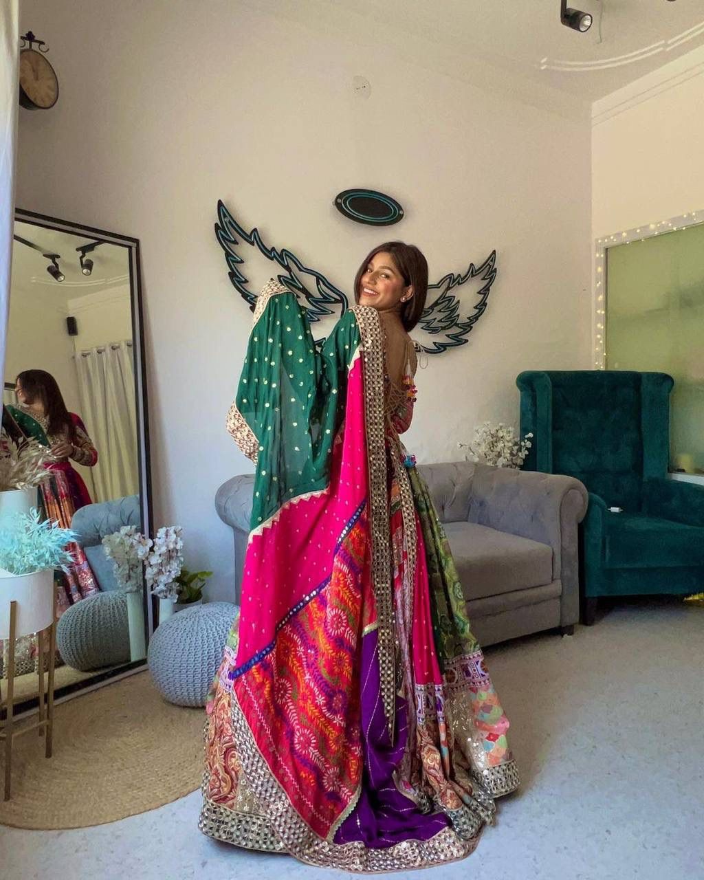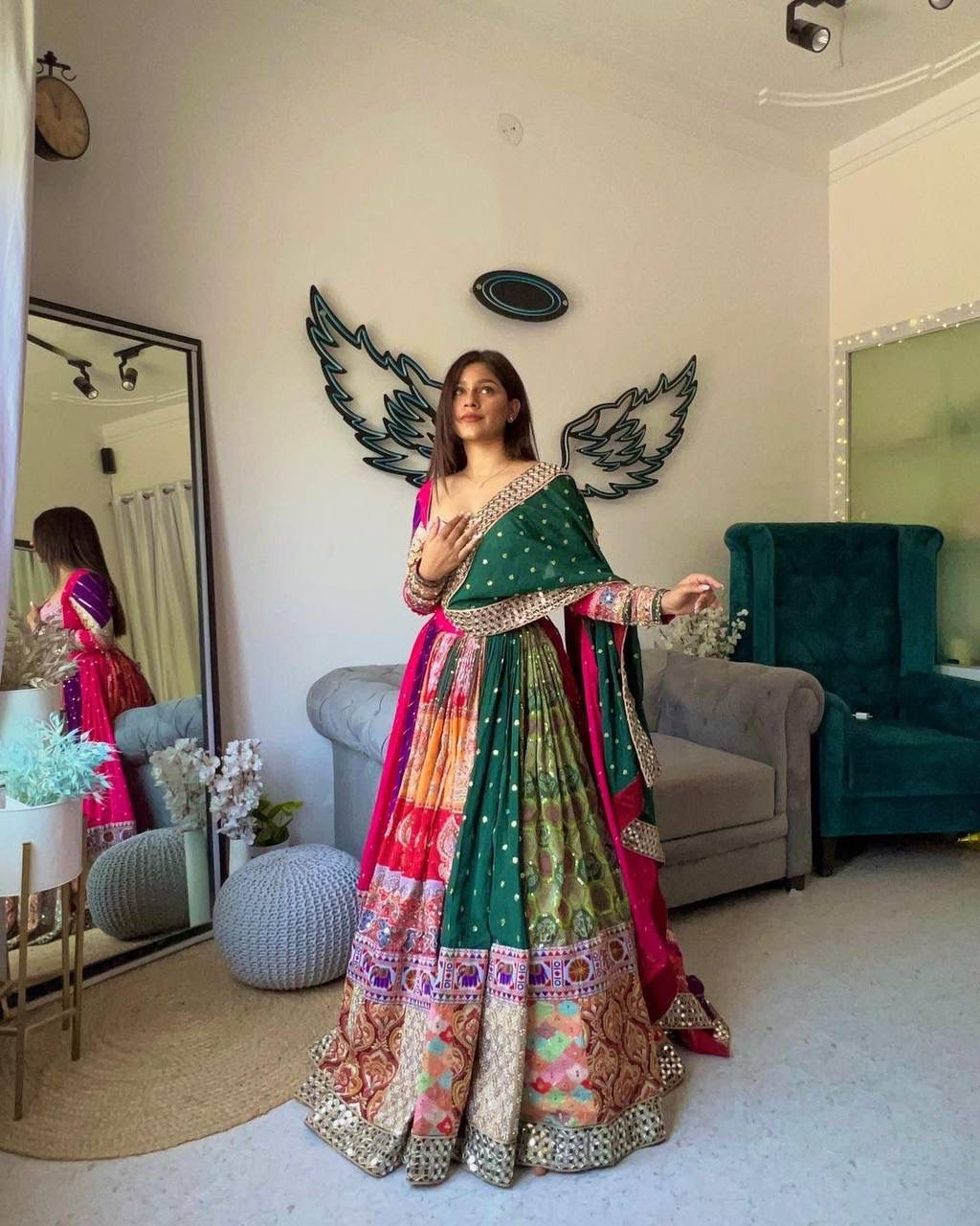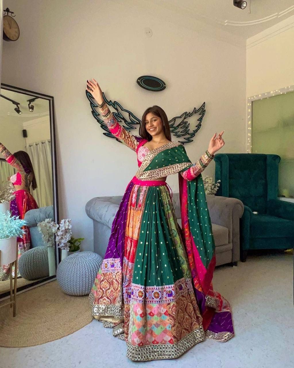 Introducing our stunning 'Navrang Lehenga Choli' - a vibrant celebration of colors inspired by the joyous festivities of Navratri. Crafted with exquisite attention to detail, this ensemble features a dazzling array of hues, reminiscent of the rainbow's vibrant charm. The intricately designed lehenga is adorned with traditional motifs and intricate embroidery, while the accompanying choli perfectly complements the ensemble with its elegant craftsmanship. Elevate your Navratri celebrations with our Navrang Lehenga Choli, a true embodiment of style, tradition, and festivity.