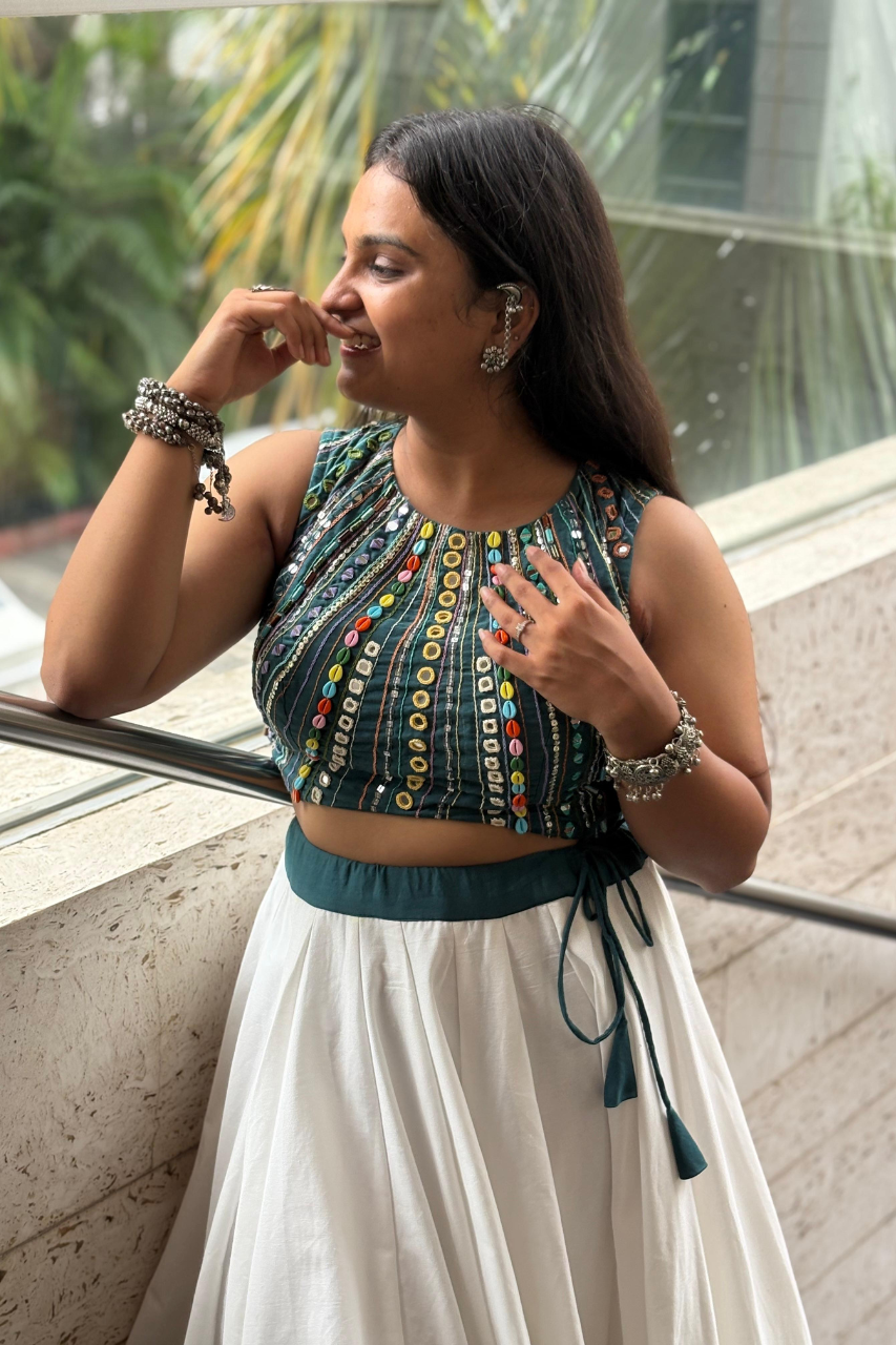 The sleeveless green mirror work crop top is a true show-stealer—featuring hand-embroidered mirror embellishments in vibrant hues and tribal-inspired thread detailing. Paired with a soft, breezy white flared skirt, this outfit brings together tradition and trend in the most elegant way.