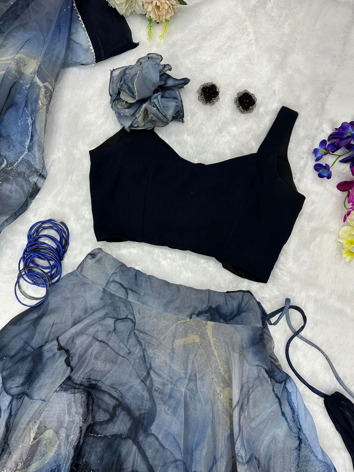 Printed Navy Blue Color Organza Silk Lehenga Choli
