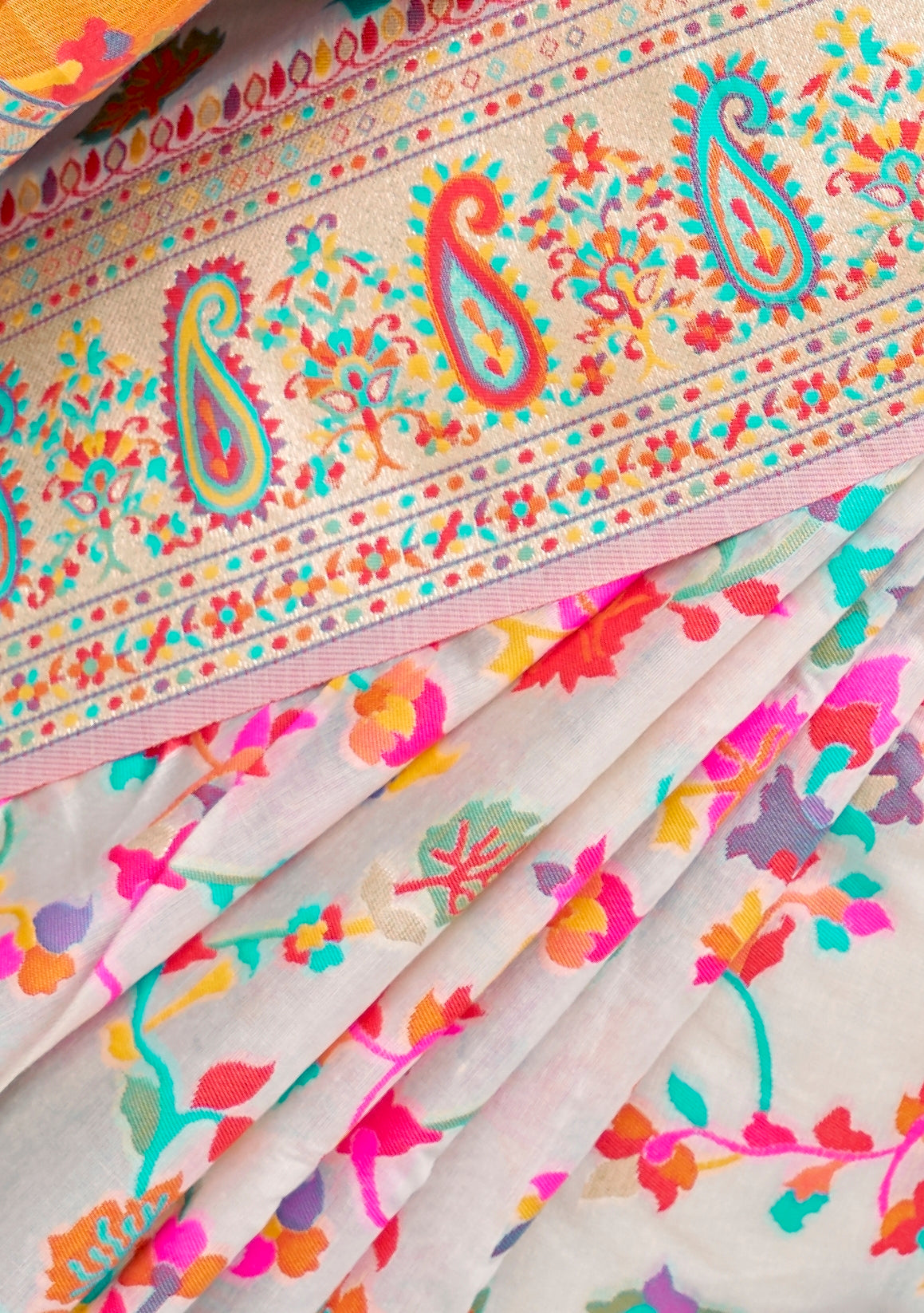 Rajwadi Pashmina White Floral banarasi Silk Saree