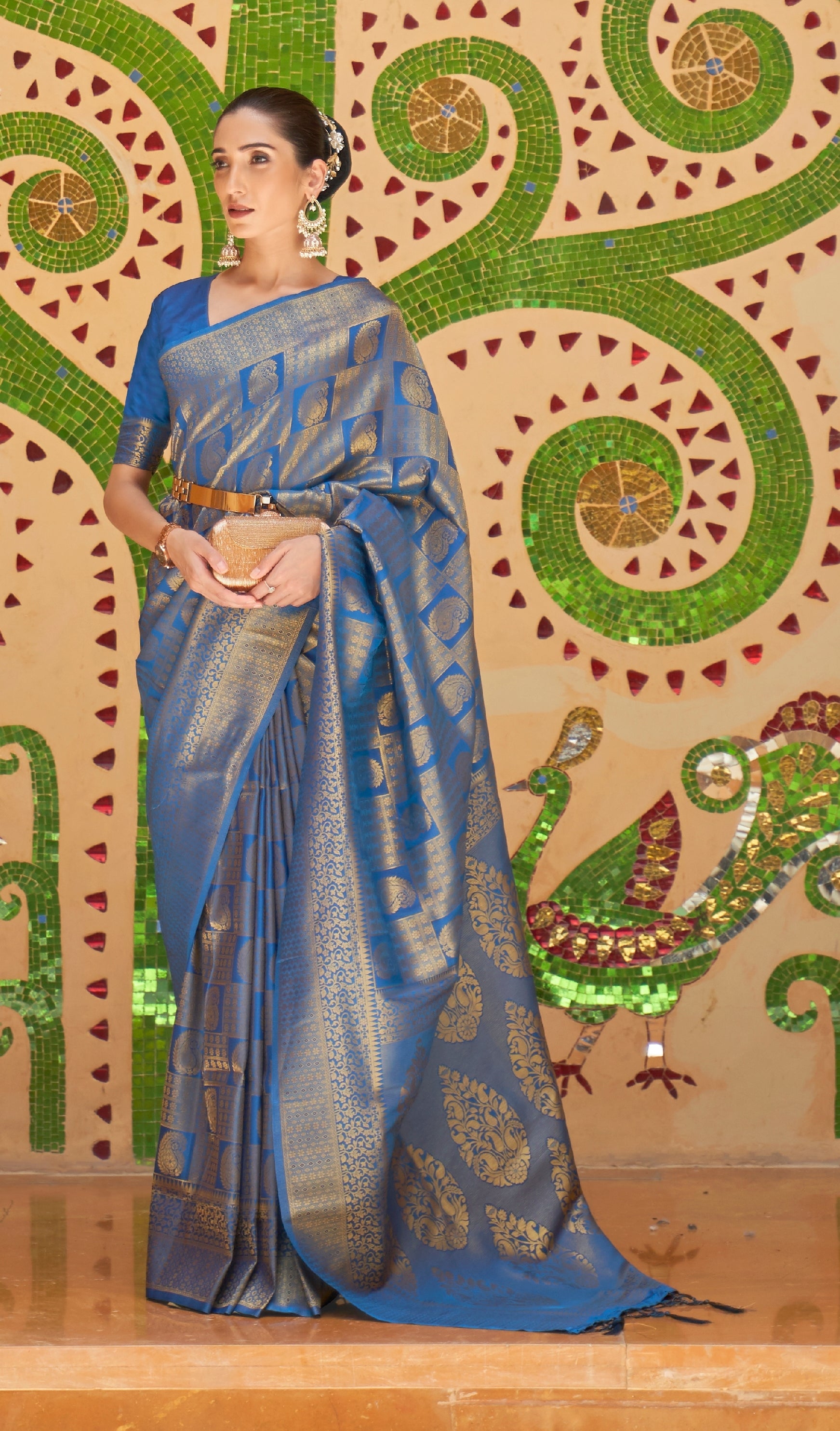 Simplicity and festive, this Kanjivaram saree easily wins hearts. With exquisite design spread across the length of the saree, it is perfect for any occasion.