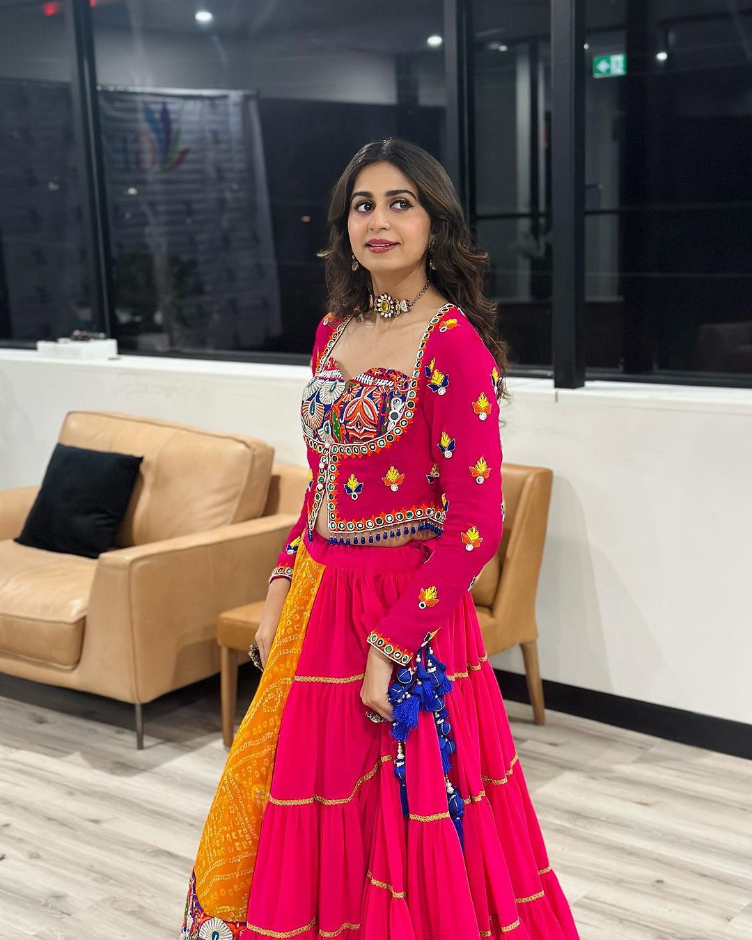 Work: 2-layer digital print with chandi and real mirror work, featuring a 10-meter flair and latkan.
