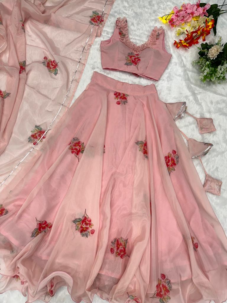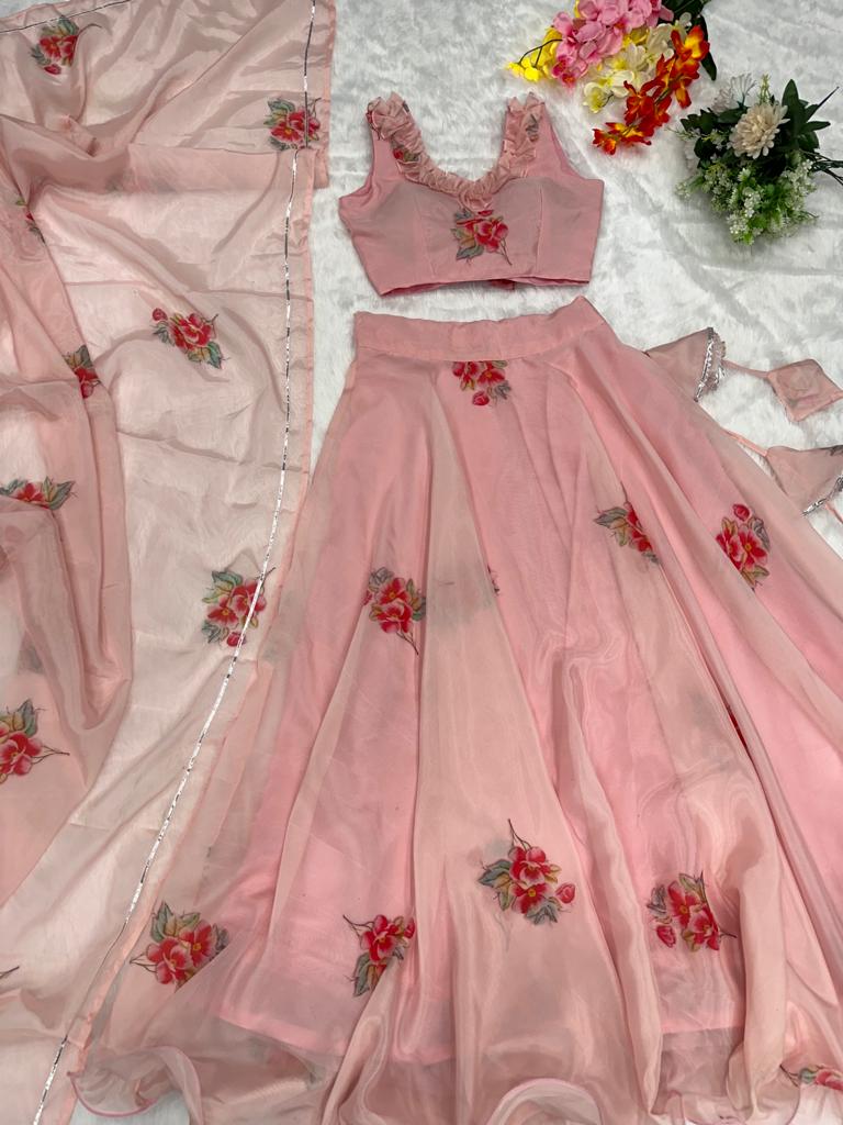 Country of Origin : IndiaLehenga Fabric Pure Jimmy Organza Silk Work Digital Printed Type Fully stitched Length 42" Size Up To 44" Size Flair 8 Meter Lehnga With Canvas Patta Choli Fabric Pure Jimmy Organza Silk Type Fully stitched Size Size 38 Padded Blouse (Margin Given) Dupatta Fabric Jimmy Organza Dupatta With Lace Border Type 2 Meter Occasion Party Wear, Ceremony Wear Product Care Instructions Dry Clean Only