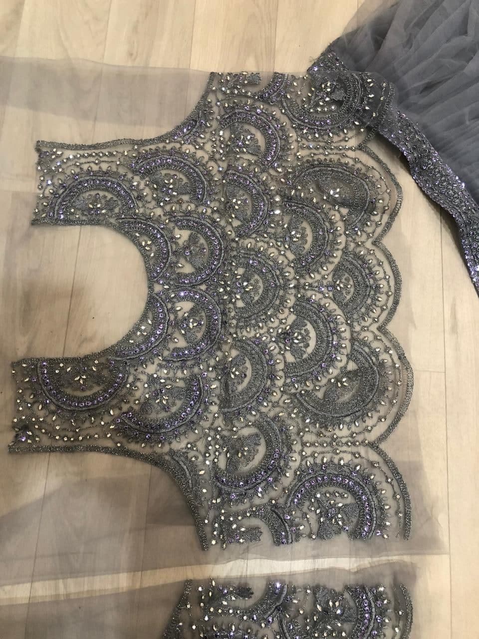 The subtle gray hue lends a touch of understated luxury, while the intricate detailing on the lehenga and choli adds a hint of traditional charm. Crafted from high-quality fabric, this ensemble ensures both comfort and style on your special day. Elevate your bridal look with this subdued yet captivating choice that seamlessly blends modern aesthetics with classic allure.