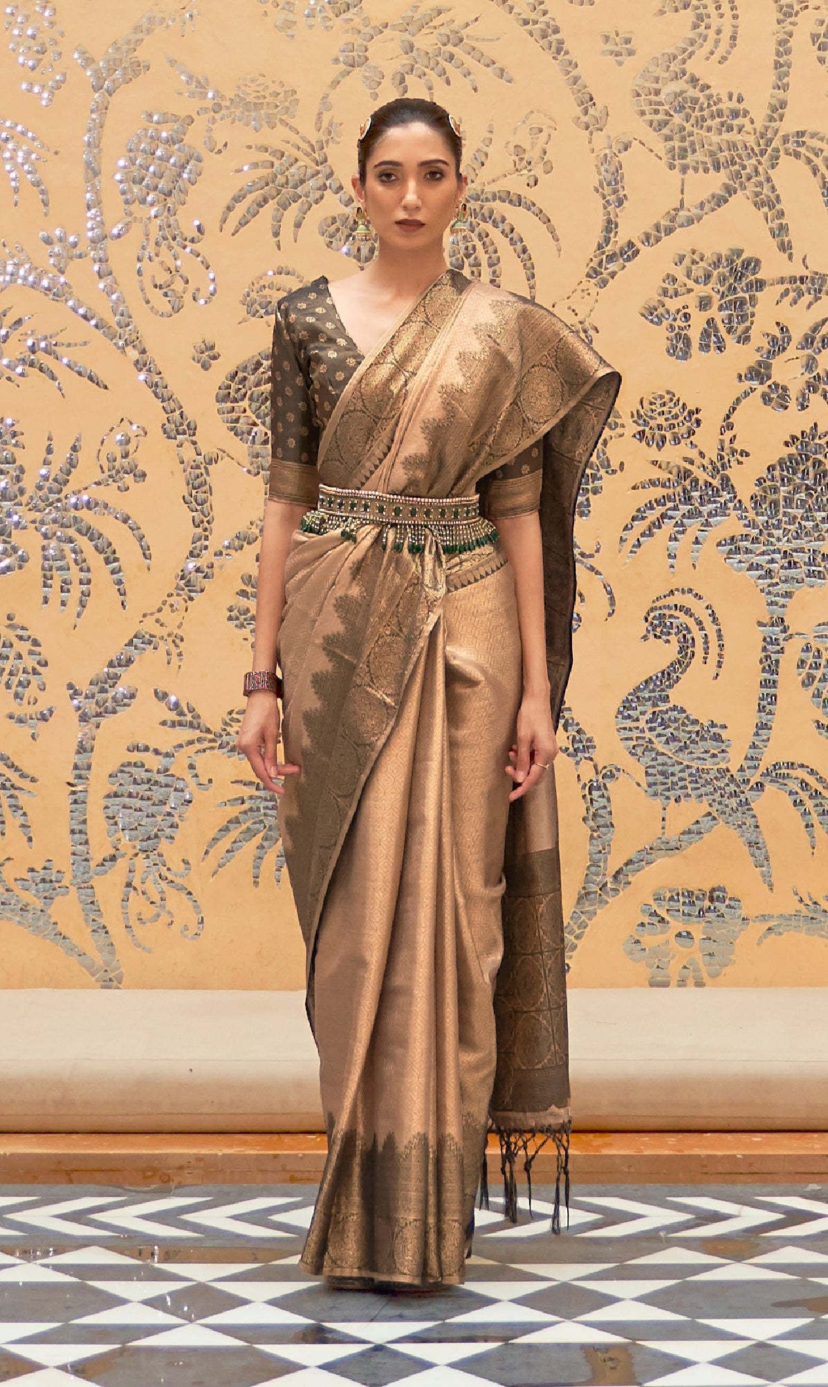 This saree is woven by master weavers of south India, They are considered to be the richest saris and are symbol of the intellectually refined elites. Style it with a potli bag and high heels for a flawless look.