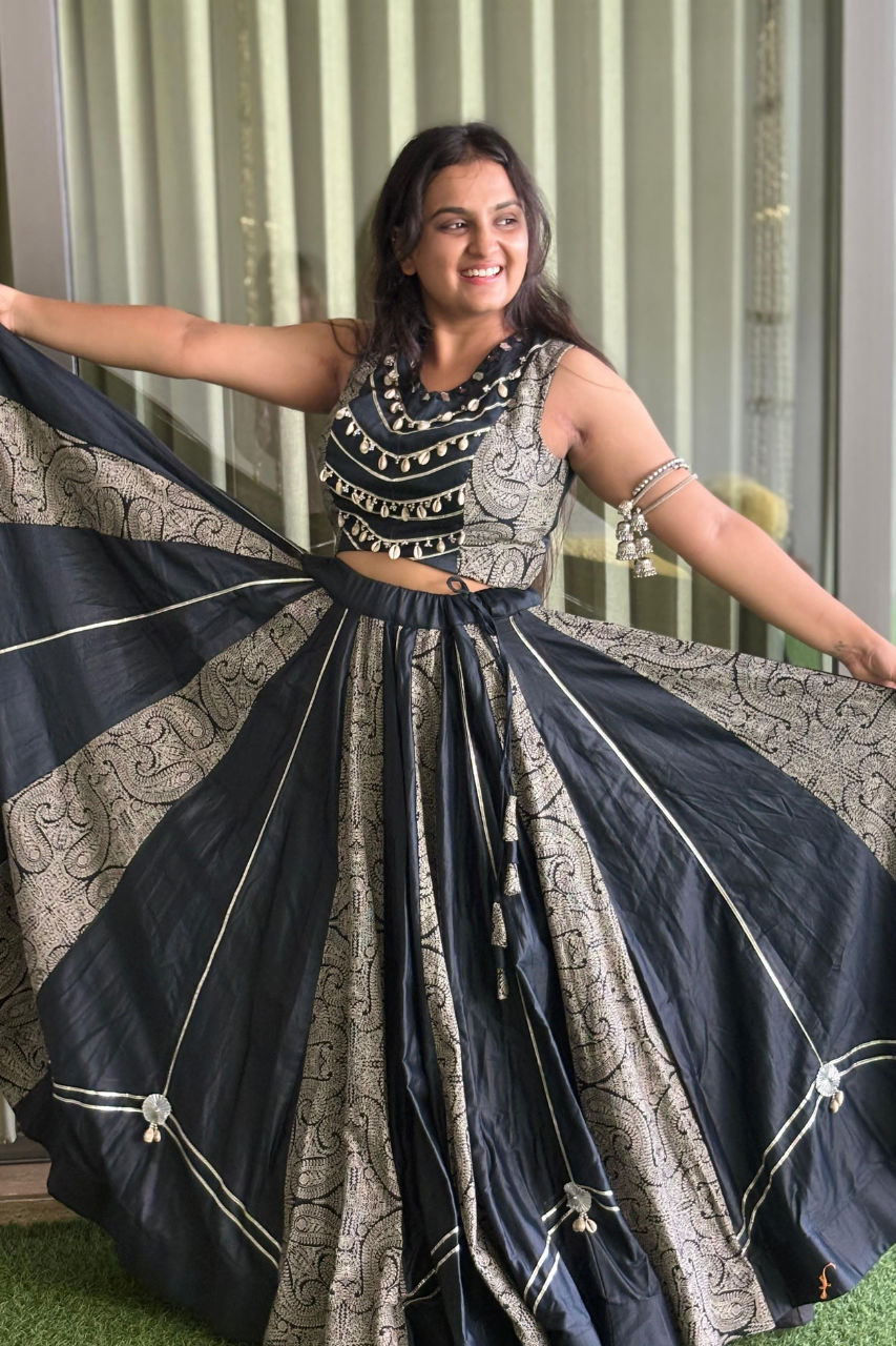 The sleek black choli is adorned with mirror embellishments and golden piping, offering a beautiful contrast of tradition and glamour. The lehenga features alternating panels of rich paisley gold zari prints and plain black fabric, creating a royal, voluminous look that sways with every step.