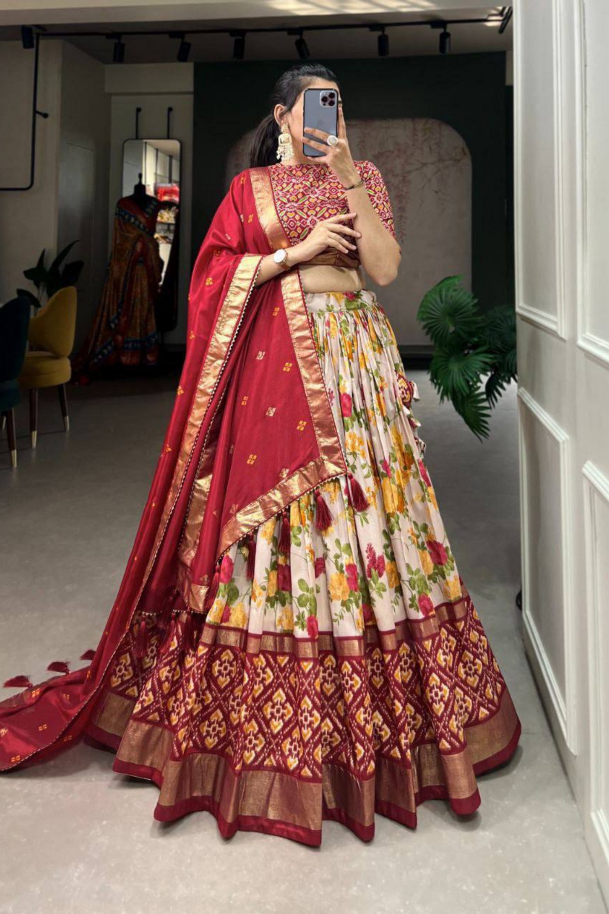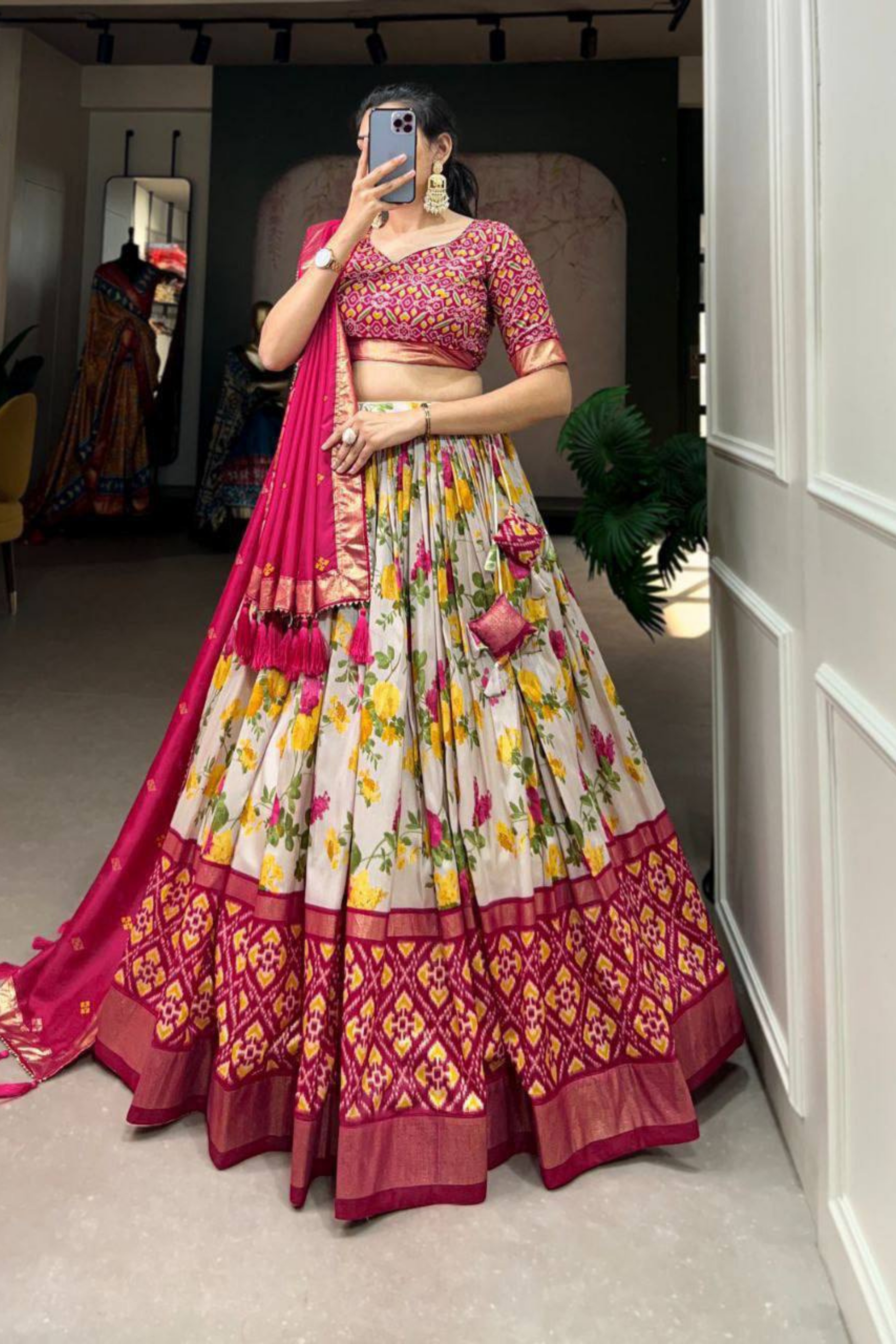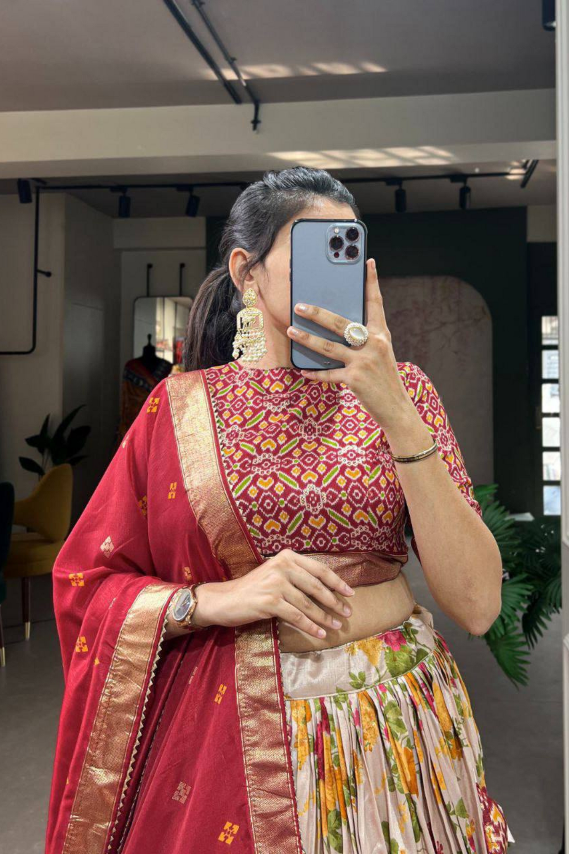 Drape yourself in the allure of Tussar Silk, adorned with a mesmerizing blend of floral and Patola prints enhanced by delicate foil work. This elegant lehenga set is a true celebration of heritage and sophistication, perfect for weddings, festivities, and grand occasions.