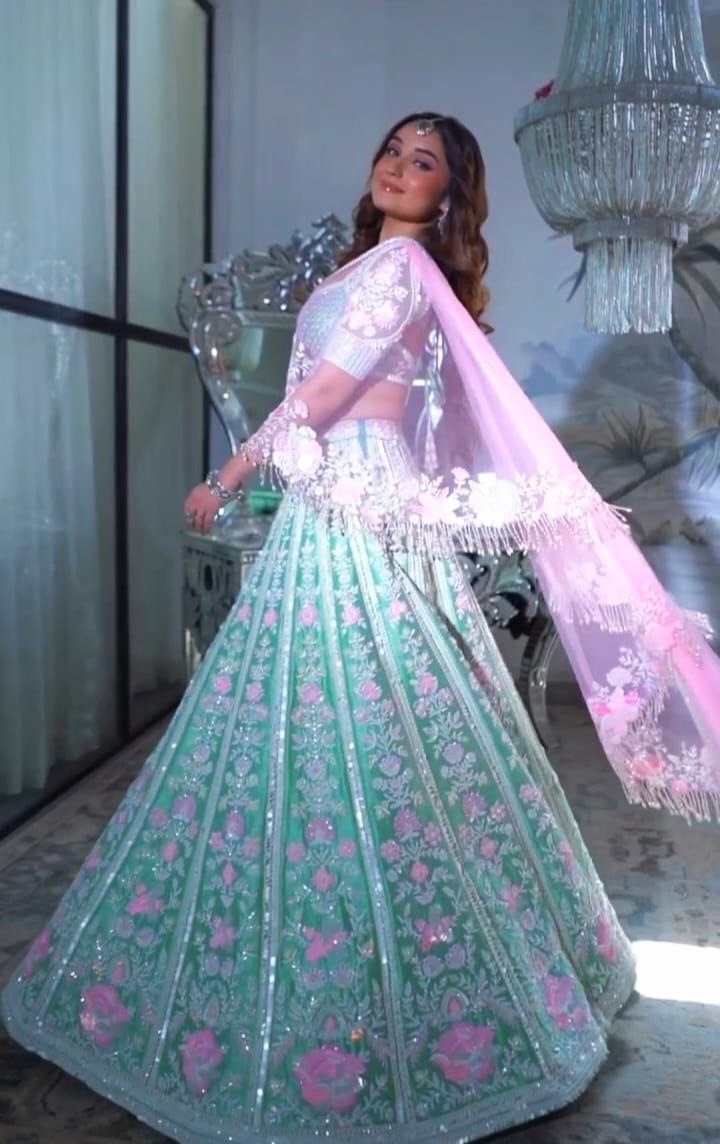Work: Viscose Thread Embroidery Work and Heavy Sequins With Heavy Cancan And Canvas With Double Inner Covering With 3.5 Mtr Flair (Semi-Stitched)