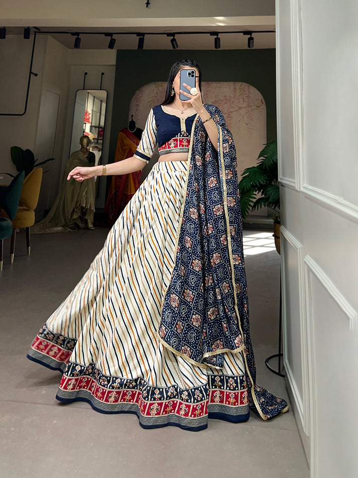White Leheriya Printed Lehenga With Navy Blue Blouse