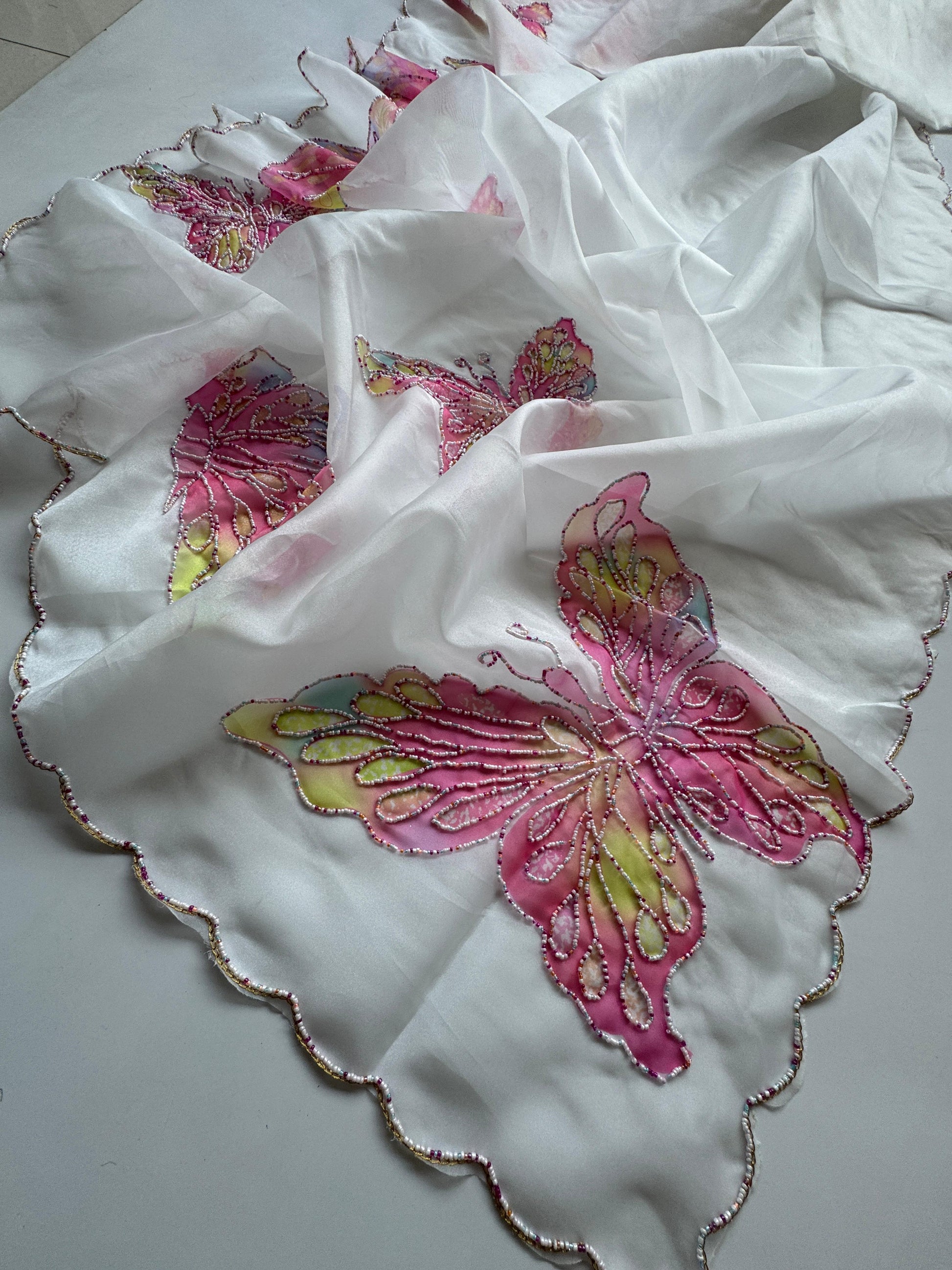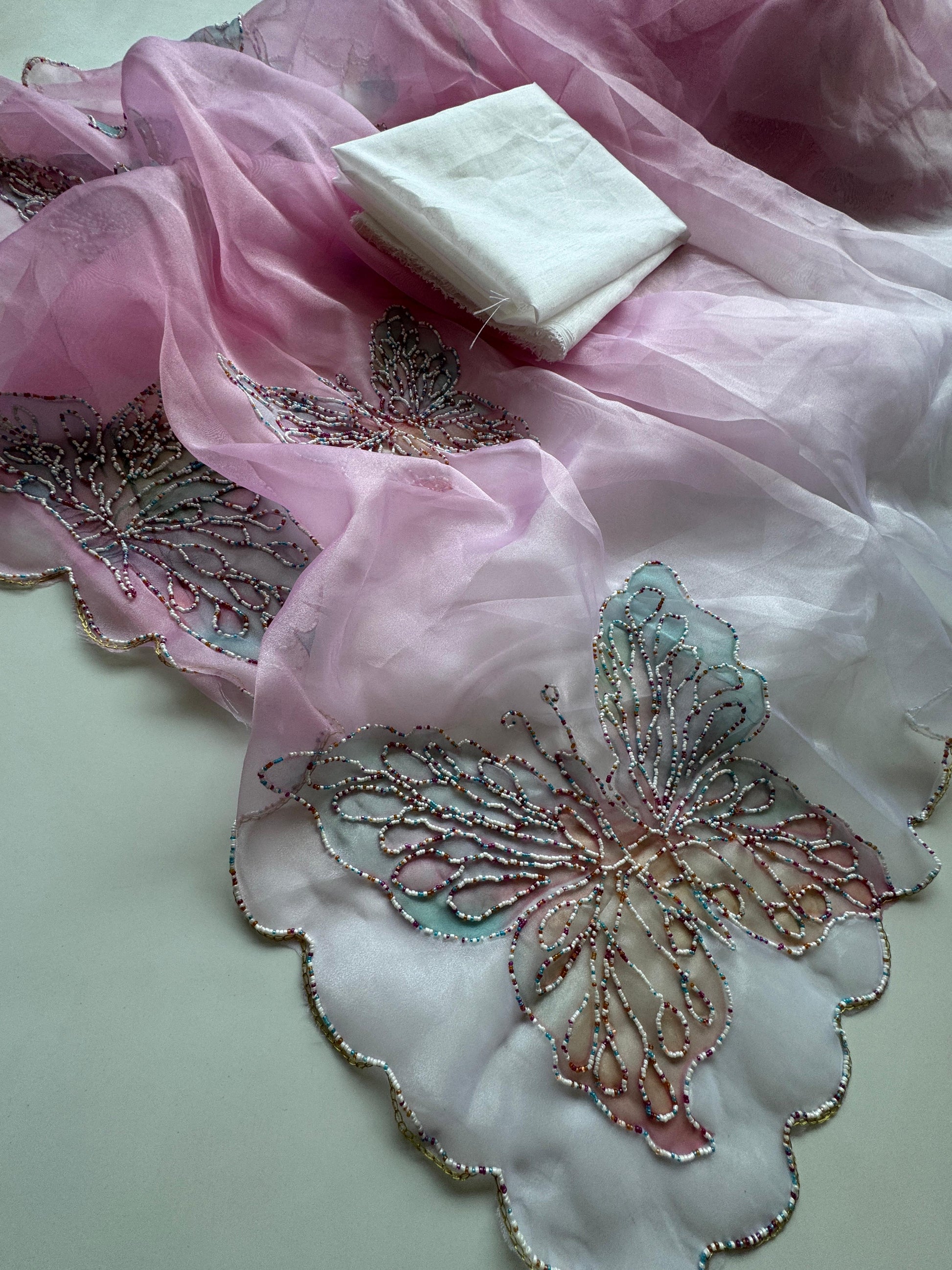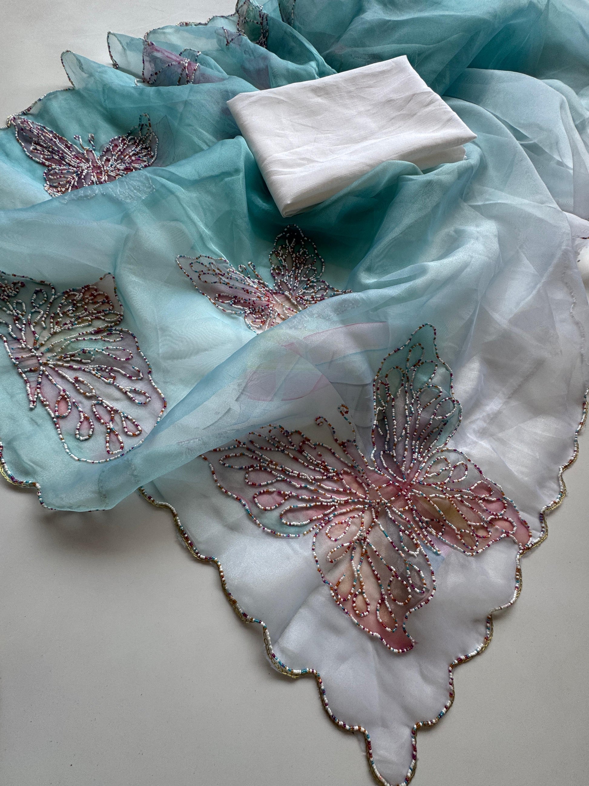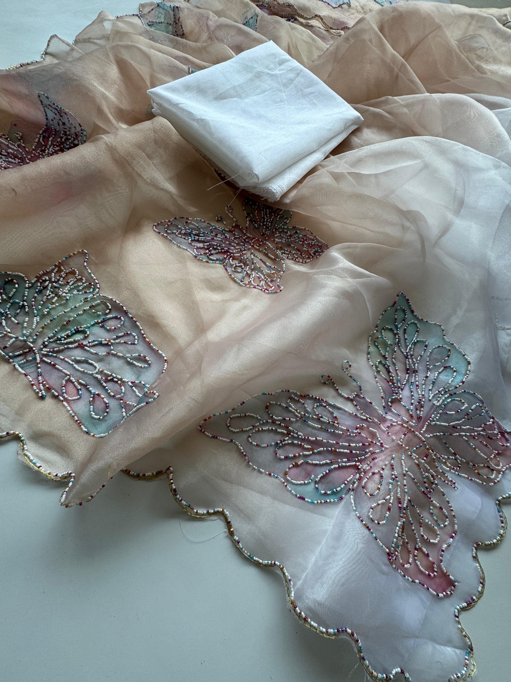 SAREE : Premium Organza Tissue Saree With Digital Printed Butterfly With Pearl Handcraft Work And Pearl Arc Border.