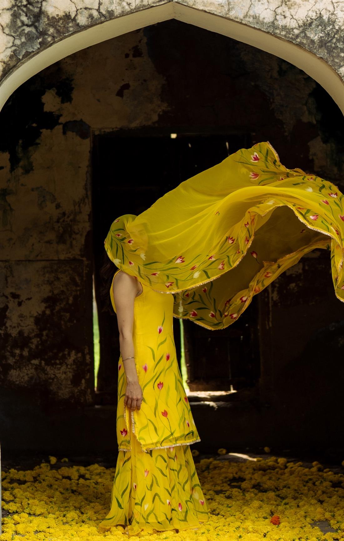 You gonna love elegance with Modern touch ,Here we Presenting Exclusive Haldi special sharara pair design